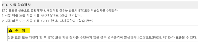잘 닦은 스로틀 바디를 장착 후에는 아래 학습 절차를 따른다. 스로틀 바디 가스킷(O-링)은 가급적 신품으로 교체해 주는 것이 바람직하다. 미처 준비하지 못했으면 그냥 넘어가자. (가스켓은 스로틀 바디에 붙어 있지 않고 흡기 매니폴드 쪽에 끼워져 있음)