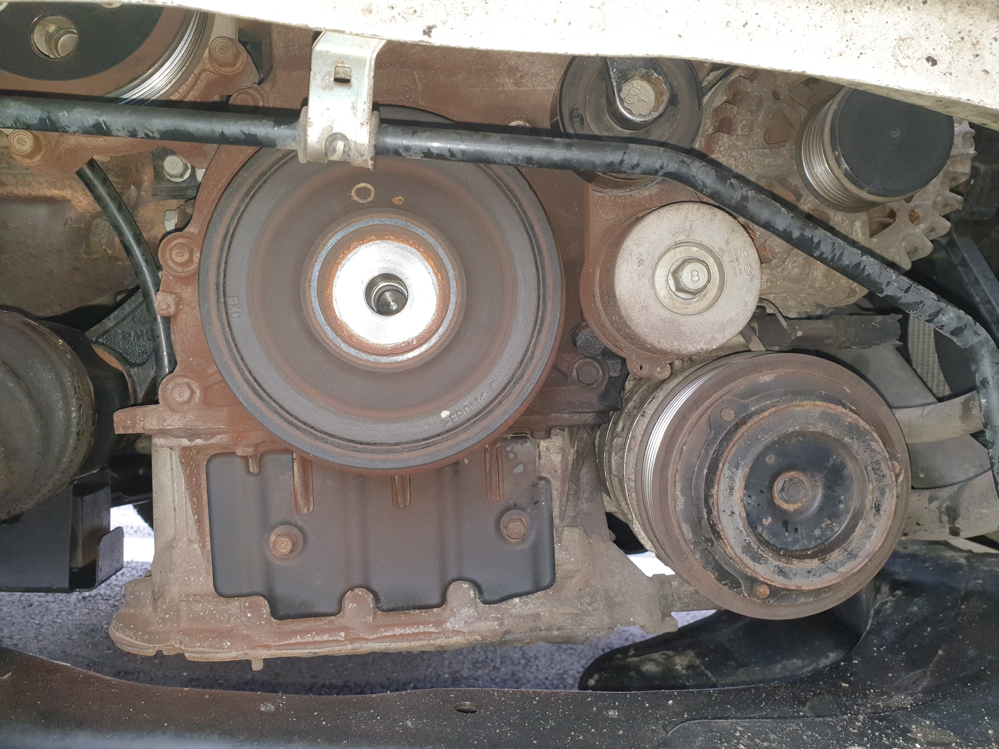 6. 댐퍼 풀리 고정 볼트(22mm)와 풀리 몸체에 페인트 마커로 일직선 표시 (나중 체결시 토크 렌치를 못쓰기 때문에 적정 토크 확인용) - 마킹하지 않고 임팩으로 볼트 풀기를 시험 삼아 도전.