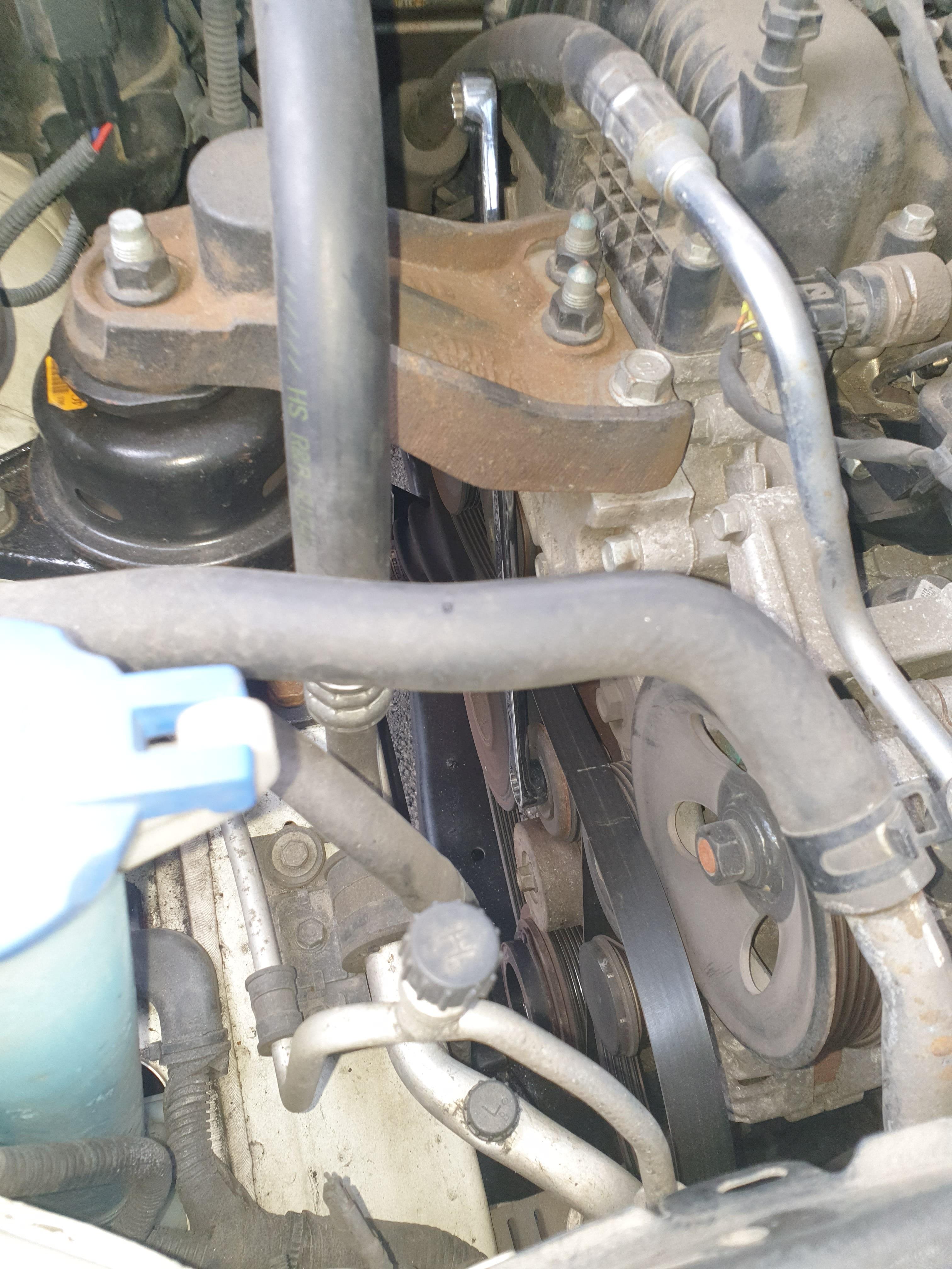 엔진룸 위에서 아래쪽을 보면서 작업할 경우 엔진 미미 브라켓이 가로막고 있어서 성가시다. 그대로 둔 채 작업은 가능하지만 아주 짜증이 나므로, 엔진 오일 팬 하단에 사다리 작키로 받친 후에 엔진 미미 브라켓을 탈거하고 작업하는 것이 훨씬 편하다. 그러나 작업 범위를 더 키우지 않기 위해서 성가셔도 그대로 둔 채 작업했다.