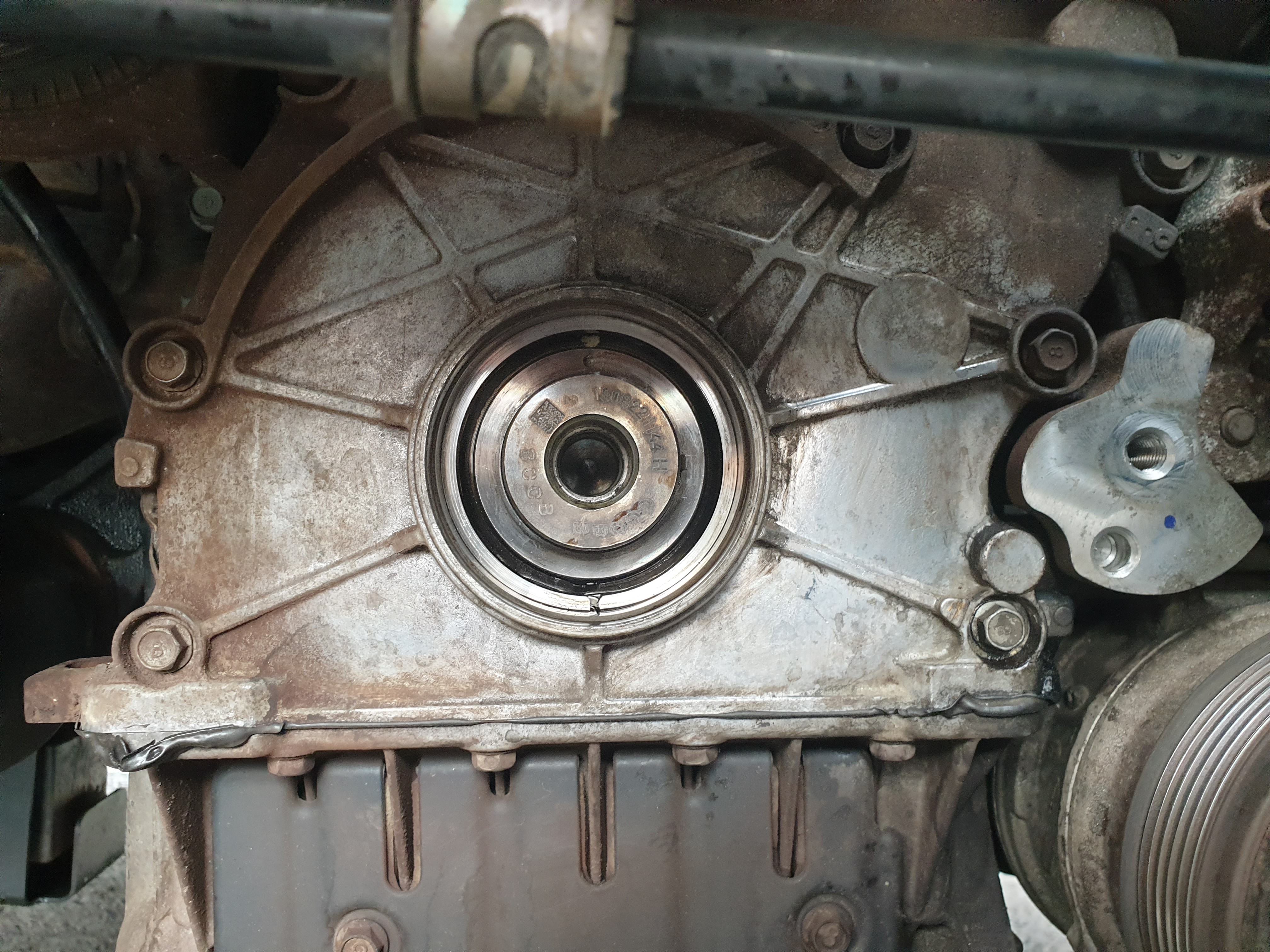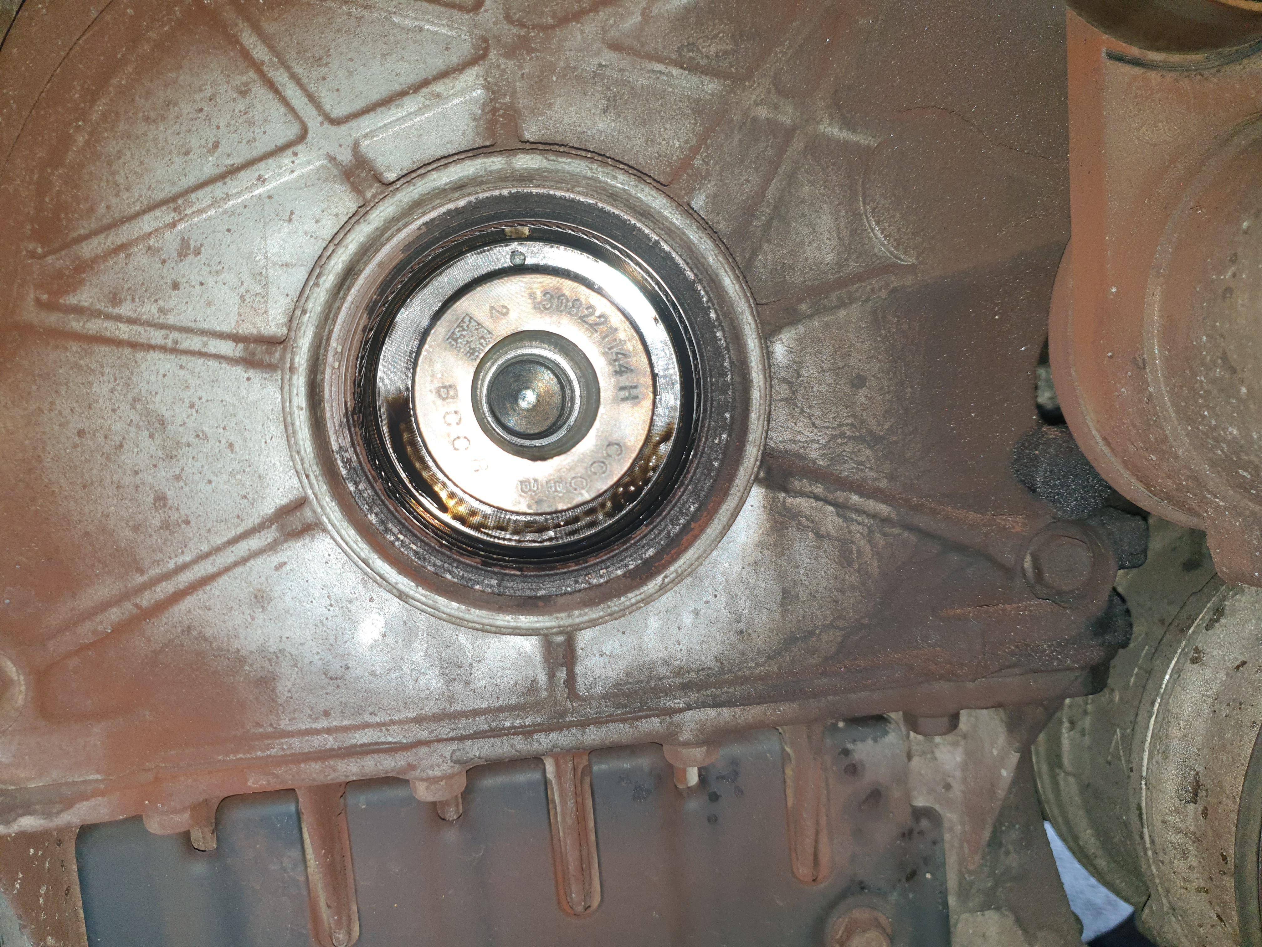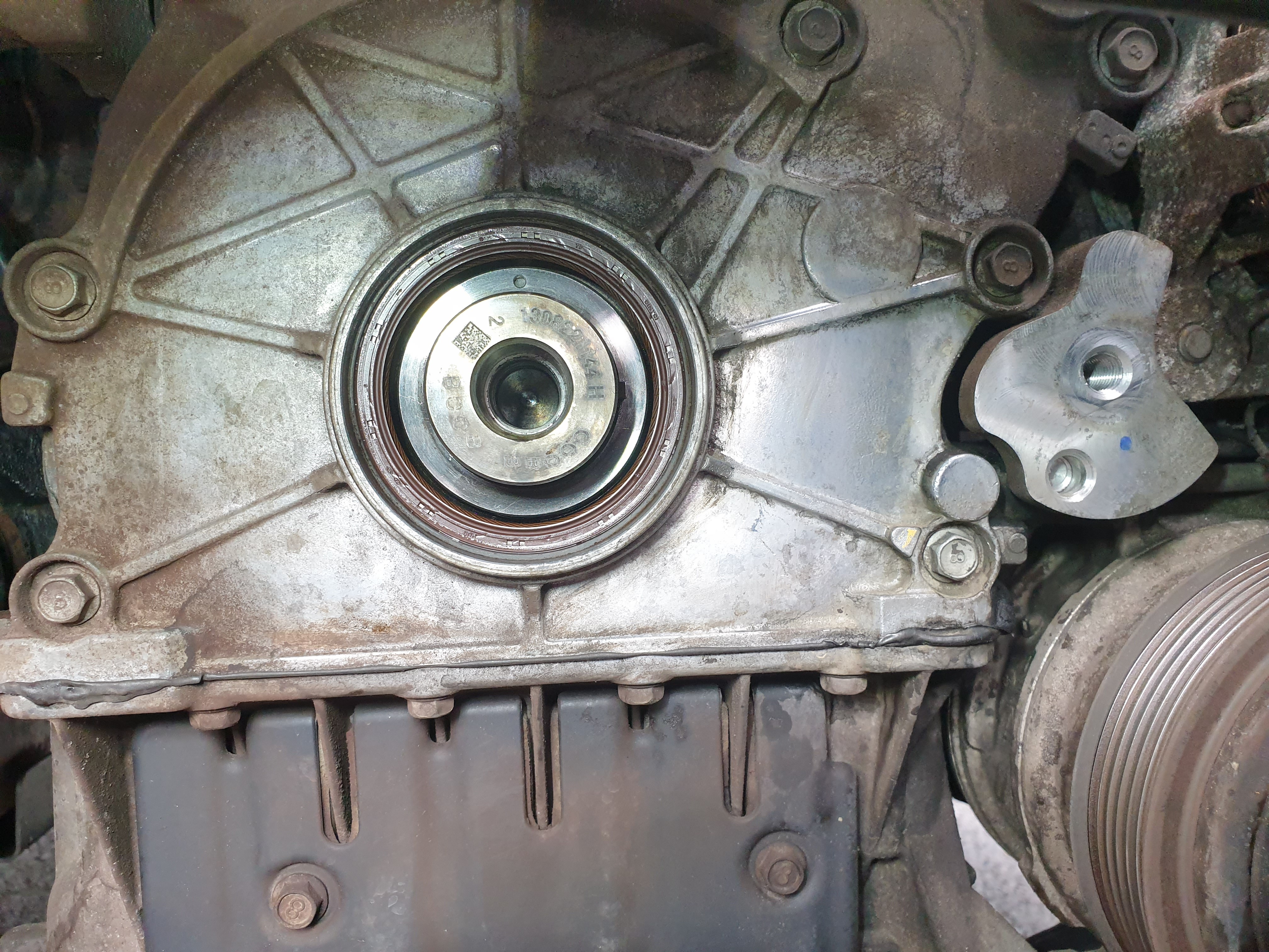 10. 크랭크샤프트 리테이너(리데나) 탈거. 전용 특수공구가 있기에 쉽게 탈거했다. 리데나에서 엔진오일이 좀 새고 있나 보다. 교체시기가 절묘하군.
