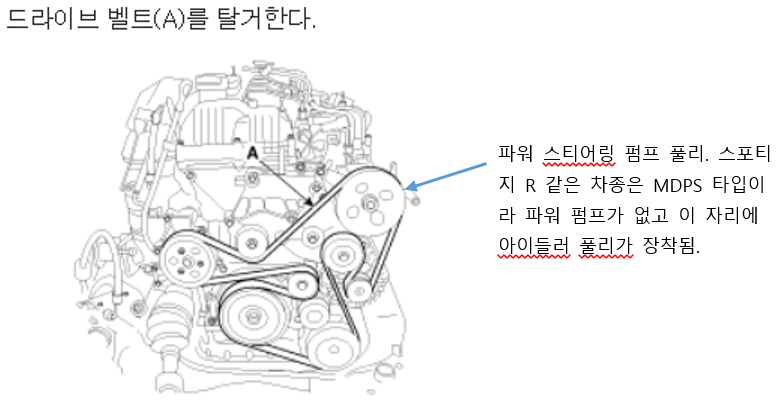 8. 텐셔너 암보스(17mm)를 시계반대방향으로 돌린 상태에서 (벨트 장력 해제) 벨트 탈거. 텐셔너를 고정핀으로 고정하고 벨트를 풀어도 된다. 단 고정핀으로 고정시켜 놓으면 댐퍼 풀리와 간섭이 일어나서 댐퍼 풀리가 안 빠지므로 텐셔너부터 먼저 탈거하고 댐퍼 풀리를 빼야 한다.