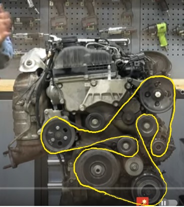 처음 해 보면 벨트를 어디부터 끼우기 시작해서 끝을 맺어야 하는지 당황스러울 수 있는데, 크랭크샤프트 풀리 --> 에어컨 풀리 --> 아이들러 --> 알터네이터 풀리 --> 파워스티얼펌프 풀리 --> 아이들러 --> 워터펌프 풀리 --> 텐셔너 풀리 순서로 끼우면 된다. 뭐 이 순서 상관없이 끼워도 된다. 좀 쉽게 끼우냐 아니면 낑낑거리면서 끼우냐 그 차이이다. 벨트를 자기 자리에 끼워도 자꾸 이탈된다. 이럴 땐 테이프로 몇 군데를 고정시켜 놓으면 이탈되지도 않고 벨트 장착이 그나마 쉽다.