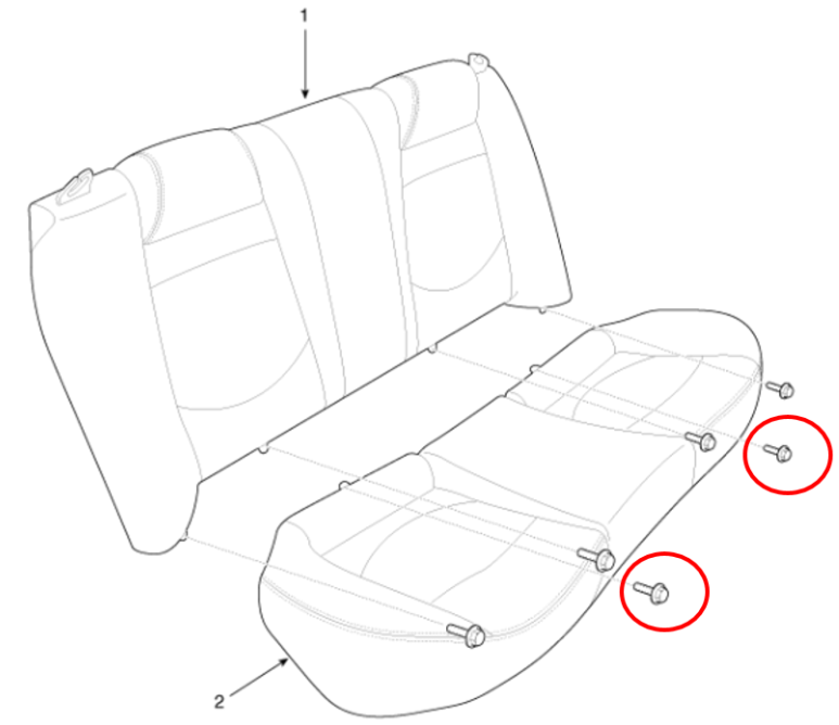 뒷자리 시트 쿠션은 12mm 볼트 2개만 풀고, 정비매뉴얼에는 설명이 누락되었는데 쿠션 좌/우측 밑을 들여다보면 그로멧(클립)이 보이는데 이것을 누른 상태에서 좌/우측 각각 위로 들어 올리면 쉽게 빠진다.