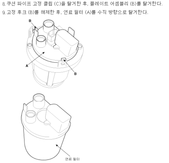 연료 펌프 앗세이는 10만 원이 조금 넘는 가격이다. 필터만 교체하면 된다. 다만 자칫 필터 교체 과정에서 뭔가 실수를 하면 일발 시동이 안 걸리기 때문에 조심해야 한다. 연료 필터는 아반떼 HD와 동일한 부품을 쓴다.