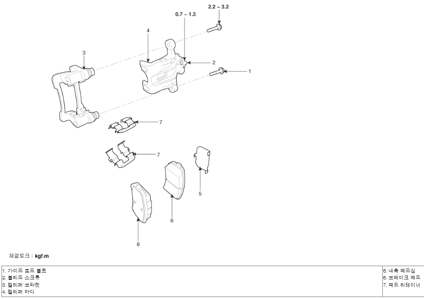 ◆ 브레이크 패드, 캘리퍼 바디 장착. 가이드 로드 볼트 체결 토크 2.2 ~3.2 kgf.m