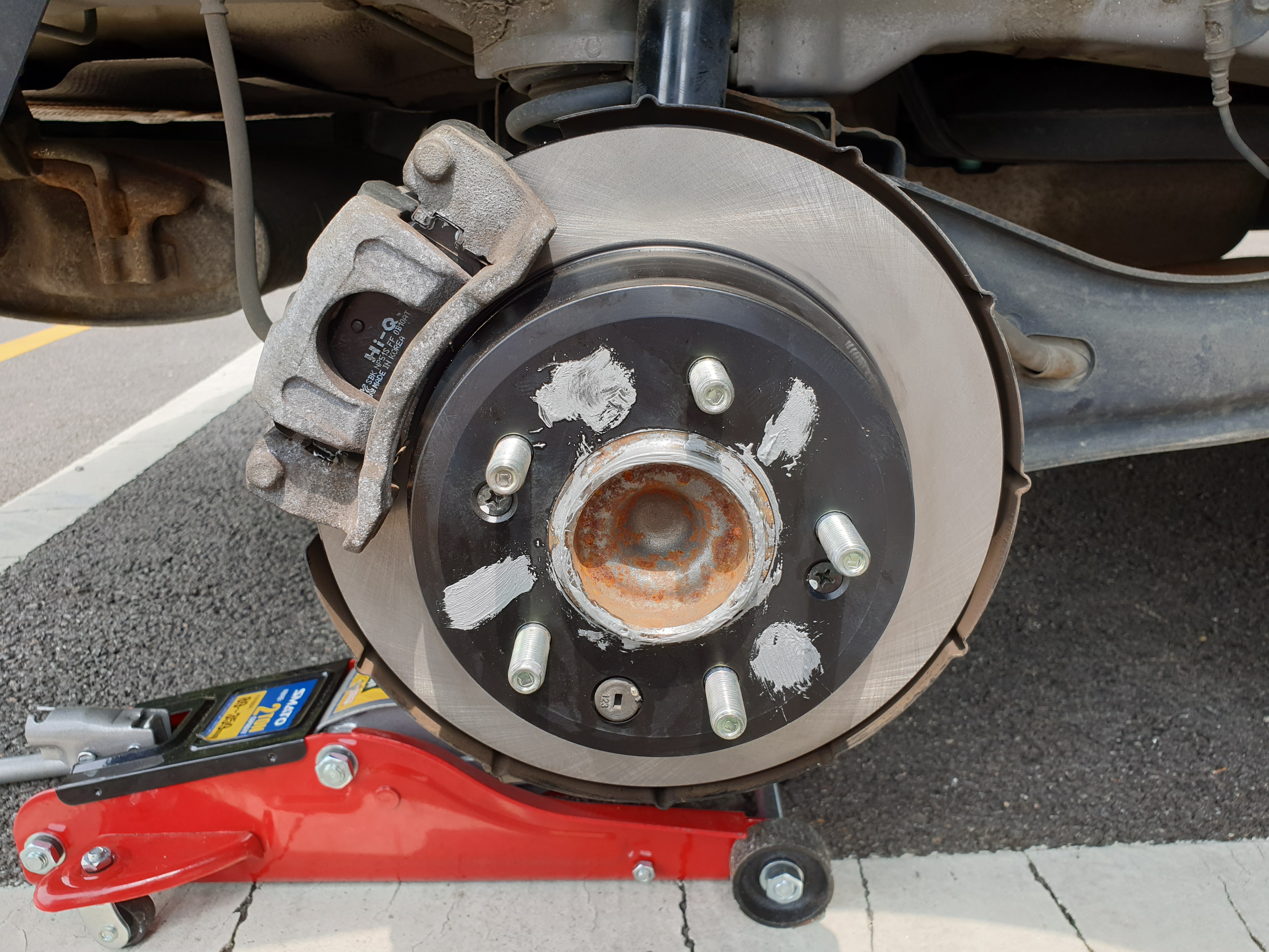 날씨가 더워서 이런 중량 작업은 하지 않으려고 했으나, 최근 리어 브레이크 패드를 교체했는데 불량한 디스크 로터에 신품 패드 전체 면이 로터에 딱 밀착되지 않기 때문에 더위를 무릅쓰고 강행했다. 넘 덥군.