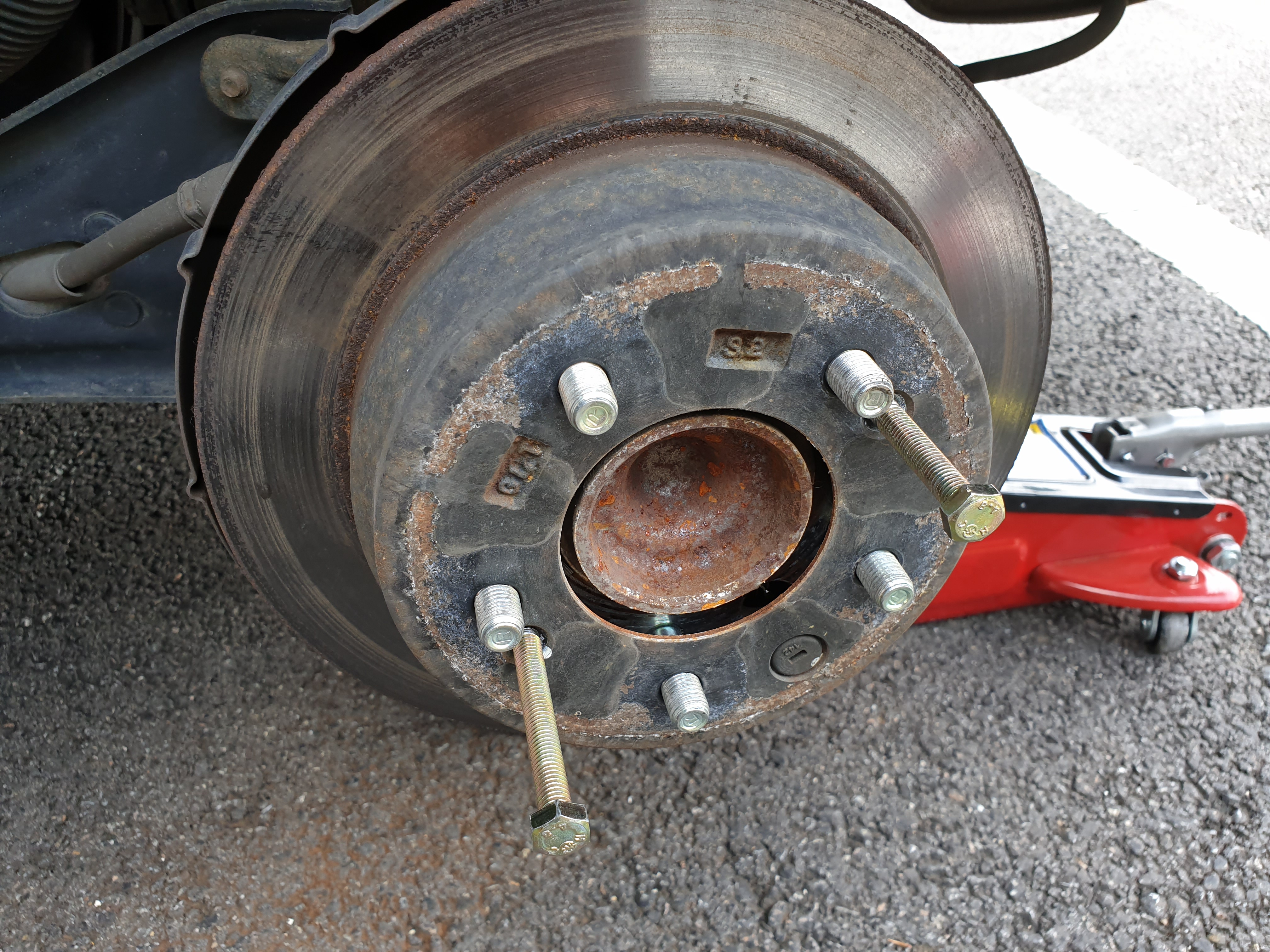 ◆ 디스크 로터 역시 허브에 고착되어 잘 안 빠진다. 이럴 땐 중량 망치로 몇 대 때려주면 고착이 풀린다. 그러나 이건 좀 무식한 방법이고 좀 더 바람직한 방법은 M8 육각 볼트(길이는 3cm 이상)를 2개 준비해서 방금 전 풀었던 스크류 구멍에 꼽고 볼트를 번갈아 가면서 조금씩 조여주면 M8 볼트가 허브에 걸리면서 고착된 디스크 로터를 반대 방향으로 밀어내면서 디스크 로터를 쉽게 탈거할 수 있다. 처음에 M8 볼트를 끼우면 잘 안 들어가서 이게 들어가는 사이즈가 아닌가 싶은 생각이 드는데 걱정 마시라. 다 들어간다. 이 방법은 나도 이번에 처음으로 해 보는 건데 망치질보다 안전하고 쉽게 고착된 로터를 탈거할 수 있더군.
