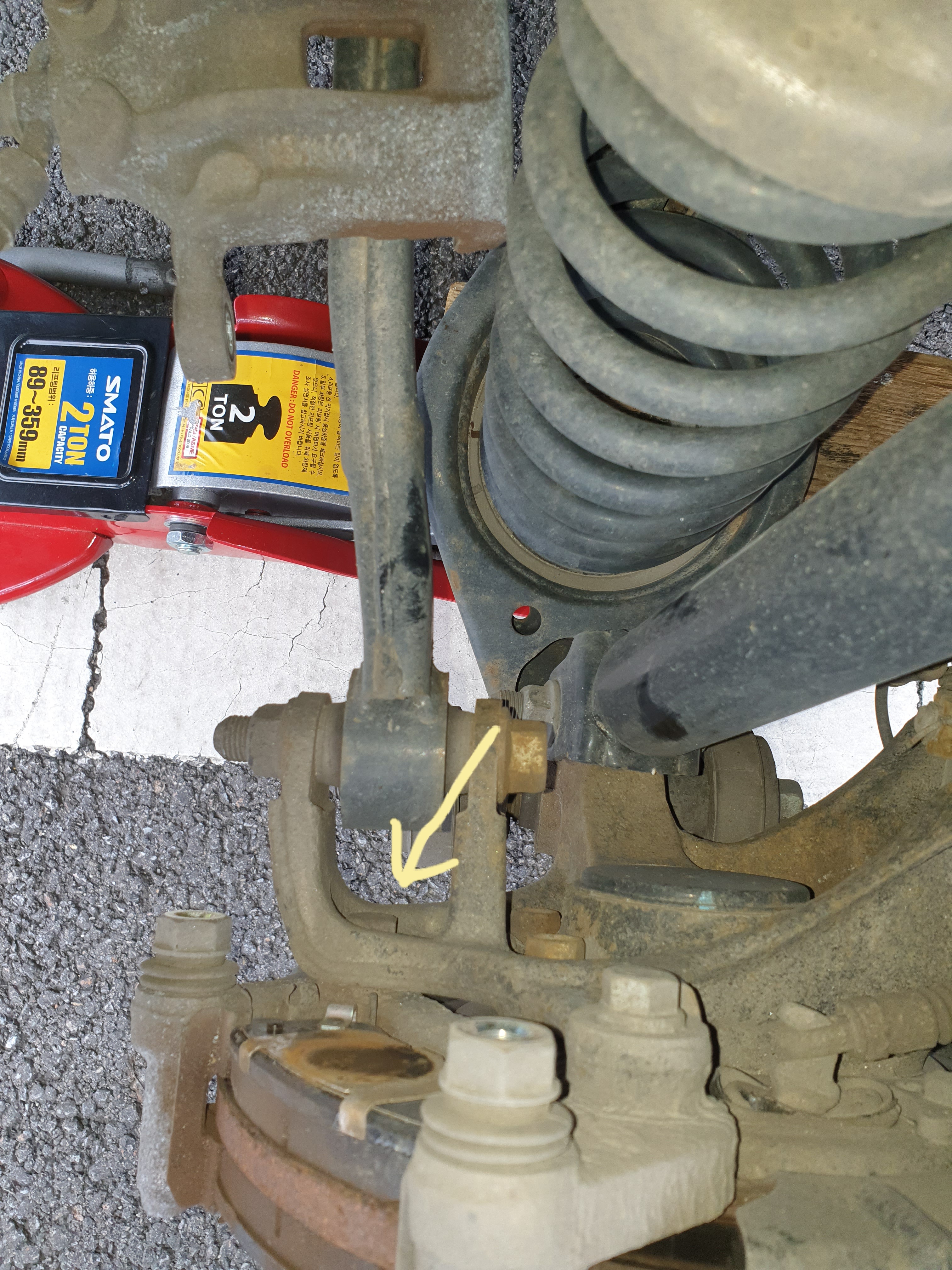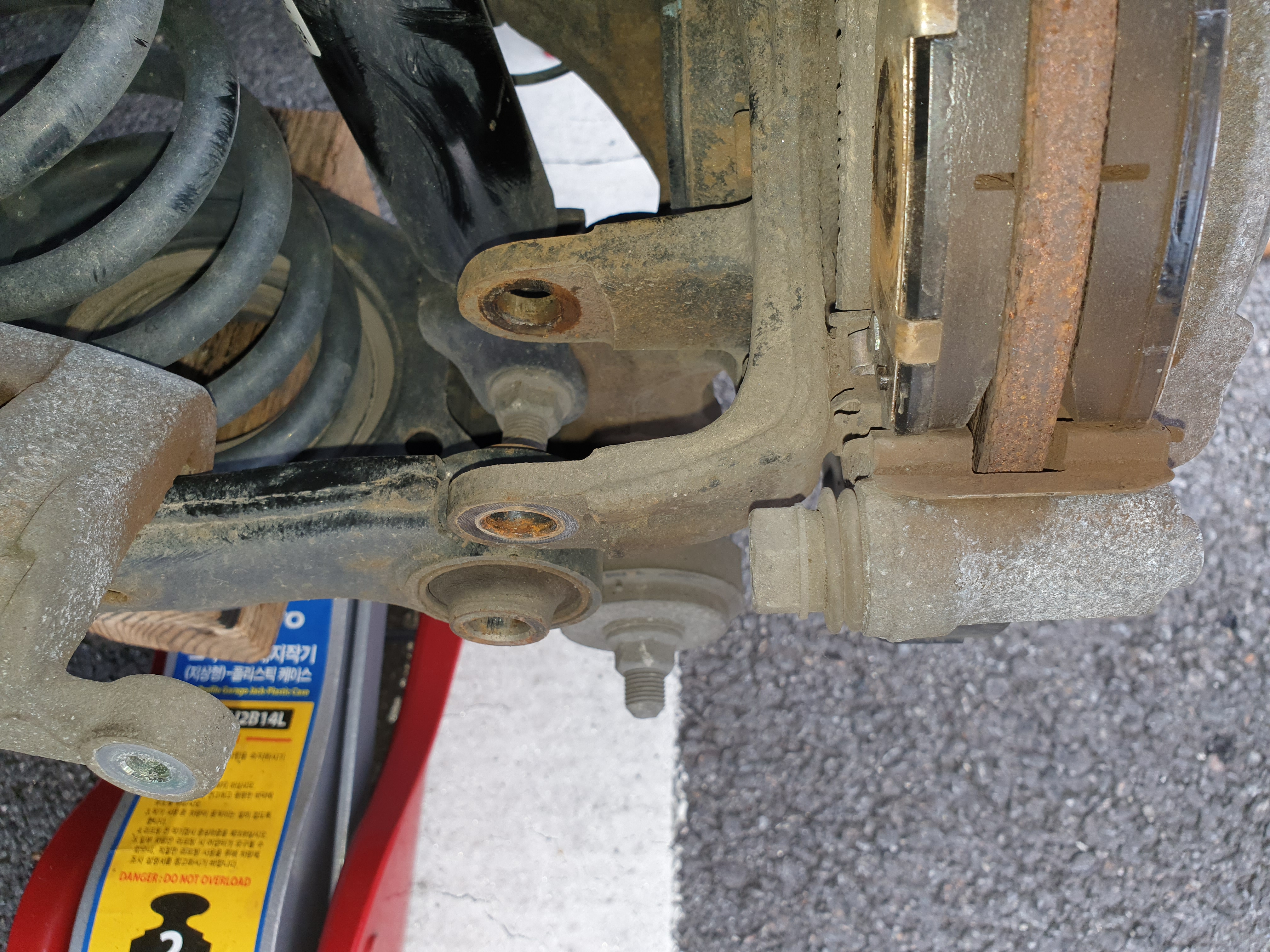 디스크 로터를 탈거하려면 캘리퍼(브라켓)를 탈거해야 하는데 차량 구조상 어퍼암을 탈거해야만 캘리퍼 브라켓 하단 고정 볼트 1개를 풀 수 있다. 지기럴. 일거리가 하나 더 늘었다. 이런 부분이 정비성을 고려하지 않고 야 일단 어떻게든 차를 만들어 봐 하는 식으로 너클 구조를 이렇게 병신력스럽게 만들어 놨기 때문이다. 어퍼암의 너클 쪽 고정 볼트/너트를 풀고 기다란 볼트를 빼내야 하는데 빼다가 바로 옆의 쇼바에 볼트가 걸려서 안 빠질 수도 있다. 그럼 쇼바 하단 고정 볼트를 풀고 쇼바 역시 옆으로 이격 시켜야 어퍼암 볼트를 뺄 수 있다.