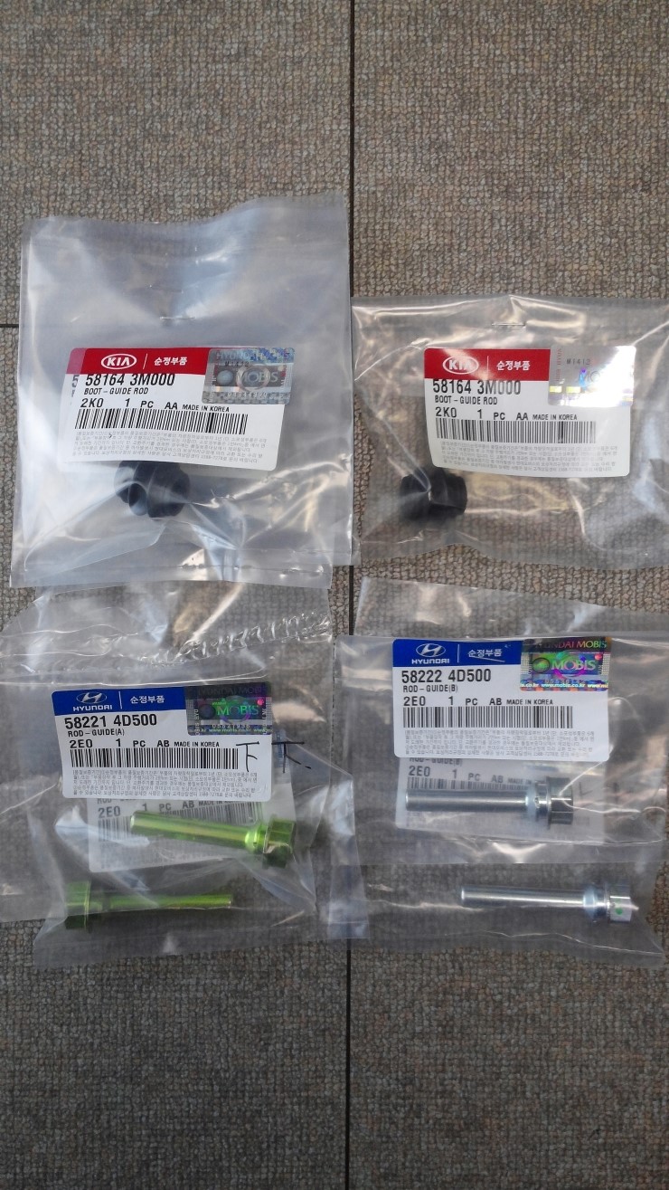 로드 가격 싸다. 개당 1200원 가량한다. 부트는 개당 7백 얼마이다. 이런 1-2천 원 부품들을 제대로 관리 안 해서 캘리퍼를 어셈블리로 개당 7-8만 원 가까이 주고 교체하는 사태가 발생하면 곤란하겠지? 제네시스의 프런트 캘리퍼는 한 8만 원가량하고 리어 캘리퍼는 7만 원이 조금 안된다. 다른 국산차들은 이보다 약간 금액이 더 싸겠지만 몇 천 원 투자해서 미리미리 큰 문제 예방합시다.