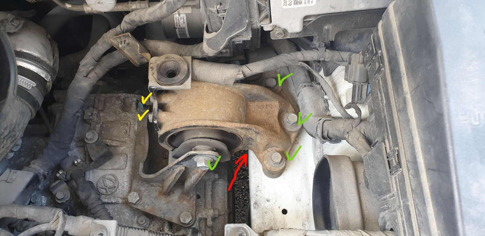 3. 미션 미미를 차체와 고정하고 있는 눈에 바로 보이는 14 mm 볼트 3개(녹색)를 푼다. 볼트 3개 중 안쪽 볼트 1개는 엔진 ECU 때문에 공구 접근이 약간 애매하므로 유니버설 조인트나 볼 조인트가 있어야 편하게 작업할 수 있다. ECU를 탈거하면 일반 복스알로도 작업할 수 있다.