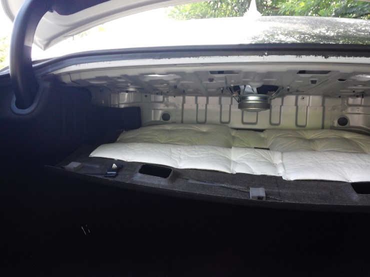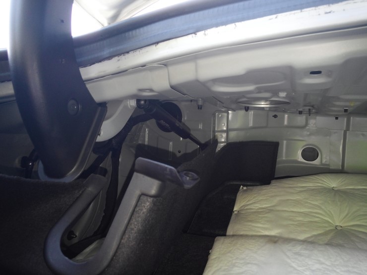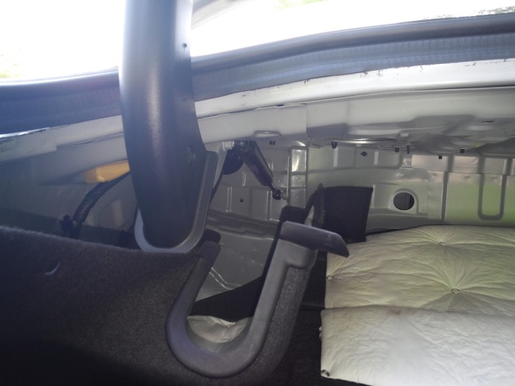 그래서 트렁크 안 위쪽 천장 내장재 탈거. 완전히 탈거할 필요 없음. 우선 트렁크 웨더스트립(고무 몰딩)을 들어낸 다음에 잘 보면 내장재 트림이 총 3개의 철판 클립으로 매달려 있는 구조로 되어 있다. 따라서 내장재를 위로 들어 올리면서 걸쳐진 클립을 벗겨내면 아래 사진처럼 내장재로 아래로 축 처지게 된다. 이대로 둔 채로 작업하면 되니 굳이 이걸 완전히 탈거할 필요 없다.