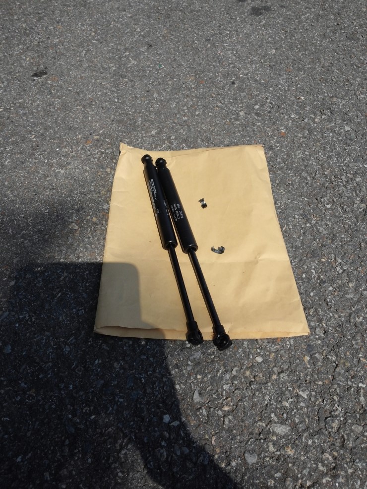 왼쪽부터 교체하고 오른쪽도 동일한 방식으로 내장재만 살짝 들어내서 교체 작업함. 쇼바는 간단한 구조로 결합되어 있으므로 기존 거 제거하는 것은 어렵지 않다. 굳이 이것까지 사진을 찍진 않았지만 인터넷 특히 유튜브 뒤지면 어렵지 않게 트렁크 쇼바(trunk lifter로 검색) 탈거 방법 알 수 있다. 탈거하고 새 부품 걍 힘으로 탁탁 치면 장착 끝.