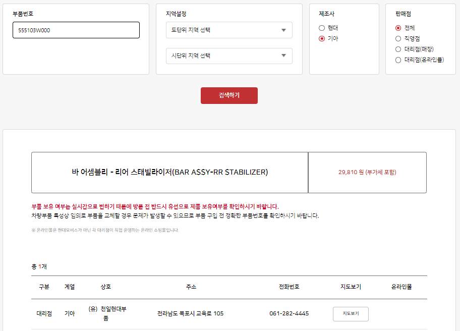 해당 품번은 "555103W000"이다. 그럼 이 부품이 전국 어느 대리점에 있는지 찾아야 한다. 부품보유점 검색을 한 결과이다.