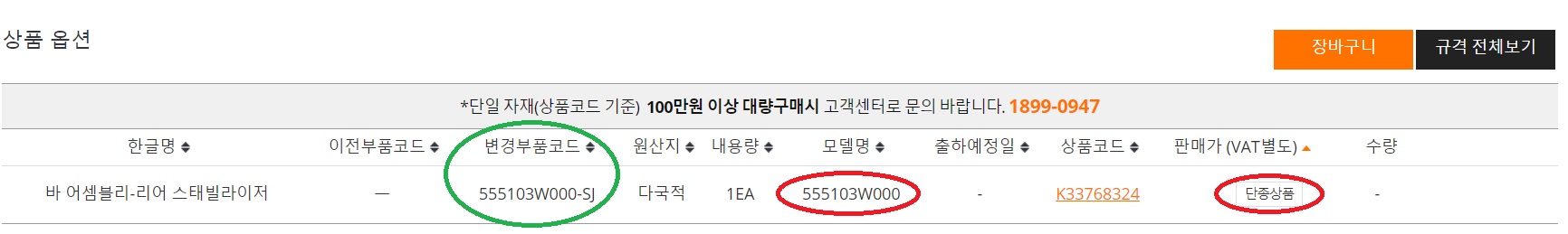 보시다시피 555103W000은 단종상품으로 나오고 좌측 녹색 원 안에 변경부품코드가 나온다. 그렇다 이게 현재 사용되는 바뀐 품번이고 이 품번을 모비스에서 조회하면 전국 재고점이 기아 기준 70여 곳, 현대 기준 100여 곳이 조회된다.