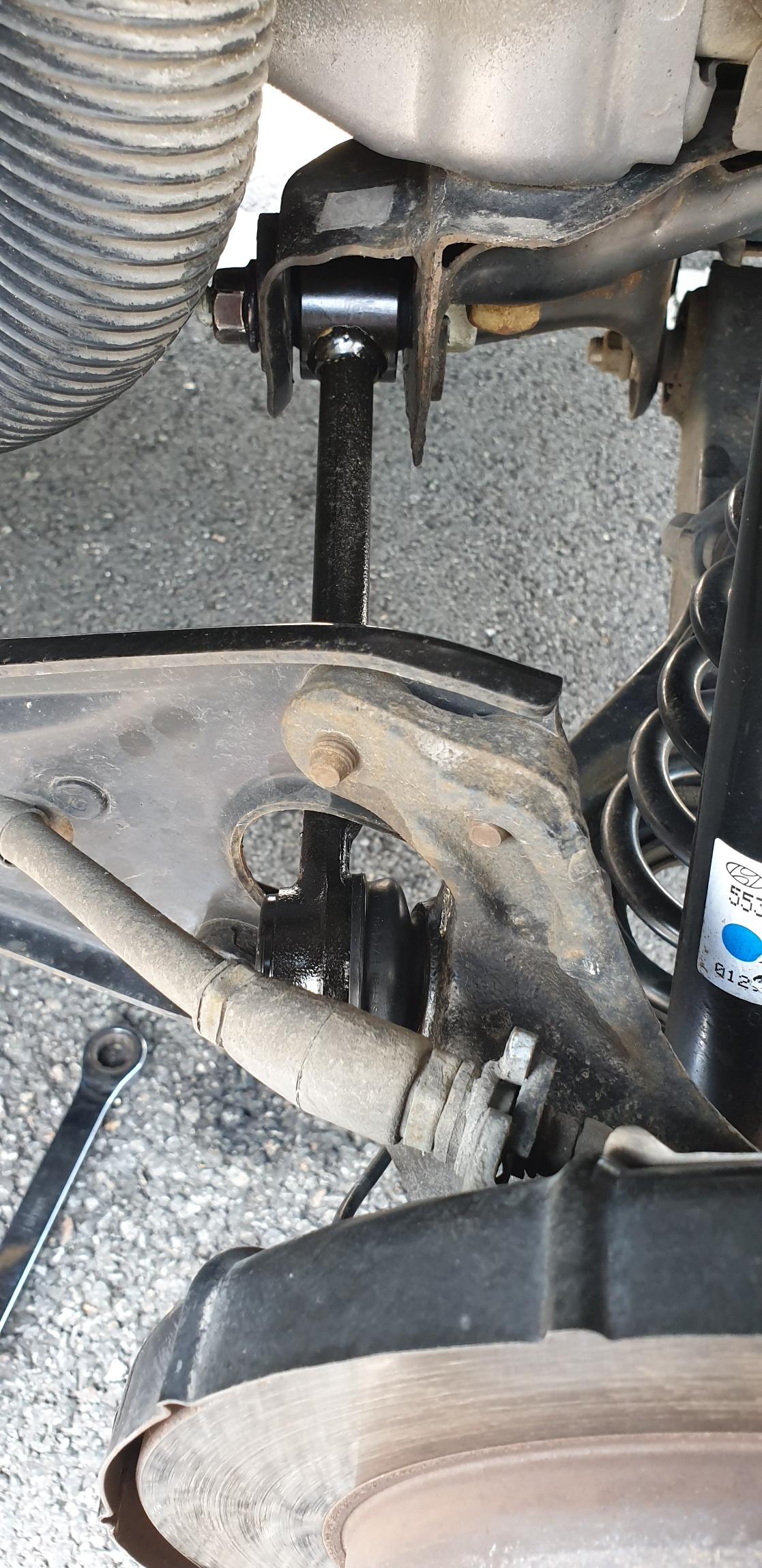 이쪽은 부싱이다 보니 공차체결을 해 주는 것이 좋은데 노상에서 이걸 제대로 할 수는 없고 자키로 로어암 하단을 어느 정도 올린 상태에서 체결하면 공차체결 효과를 어느 정도 얻을 수 있다. 체결 토크 11 ~ 12 kgf.m