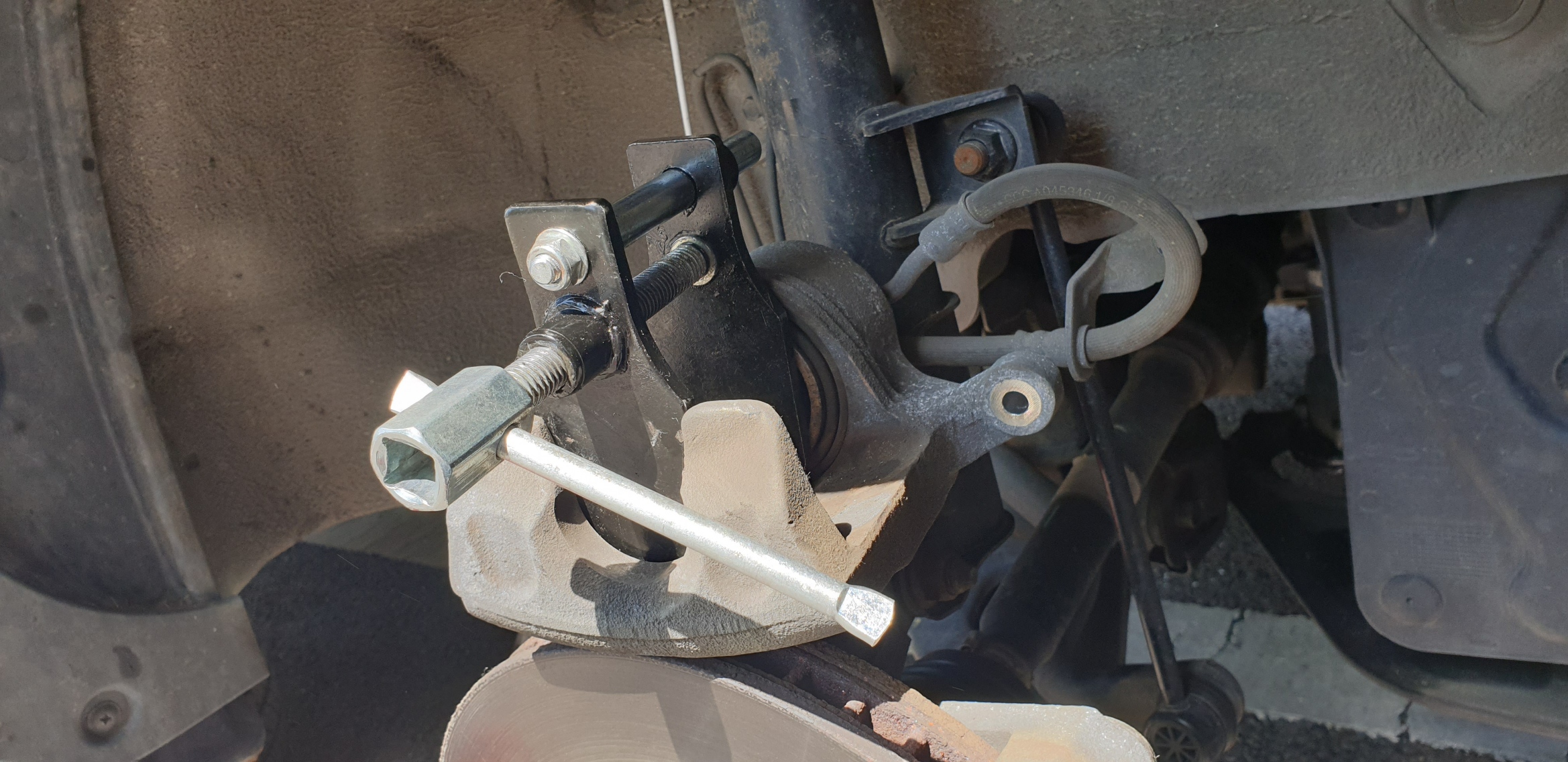 전용 공구로 밀려 나온 피스톤을 밀어 넣었다. (초보자를 위하여 설명하면, 패드가 닳으면서 피스톤은 그만큼 밀려 나오게 되고 두꺼운 신품 패드를 끼우려면 반드시 밀려 나온 피스톤을 다시 집어넣어야 신품 패드가 장착됨)