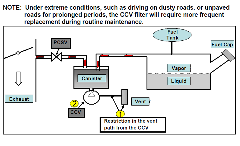 CCV는 전원이 인가되지 않은 상태에서는 항상 열려있어야 하는 밸브라고 한다.. 자동차 진단 스캐너에서 EVAP시스템 누설시험을 할 경우에 이 CCV가 닫혀서 캐니스터와 대기를 차단한다고 한다. 이 CCV 끝단은 연료탱크 에어 필터와 연결되어 있고 따라서 에어 필터는 대기와 통하게 되어 있겠죠. 만일 자동차 연료 탱크가 대기와 통하지 않는 상태가 되면? 큰일 납니다. 연료펌프가 연료를 계속 뽑아내면 탱크 내부는 음압(negative pressure)이 발생하여 탱크가 찌그러질 수 있습니다. 또한 대기와 통하지 않을 경우 탱크 내부에 유입된 에어 및 유증기가 꽉 차 있을 경우 기름을 주유해도 잘 들어가지 않겠죠. 그렇기 때문에 항상 대기와 통하고 있어야 한다.