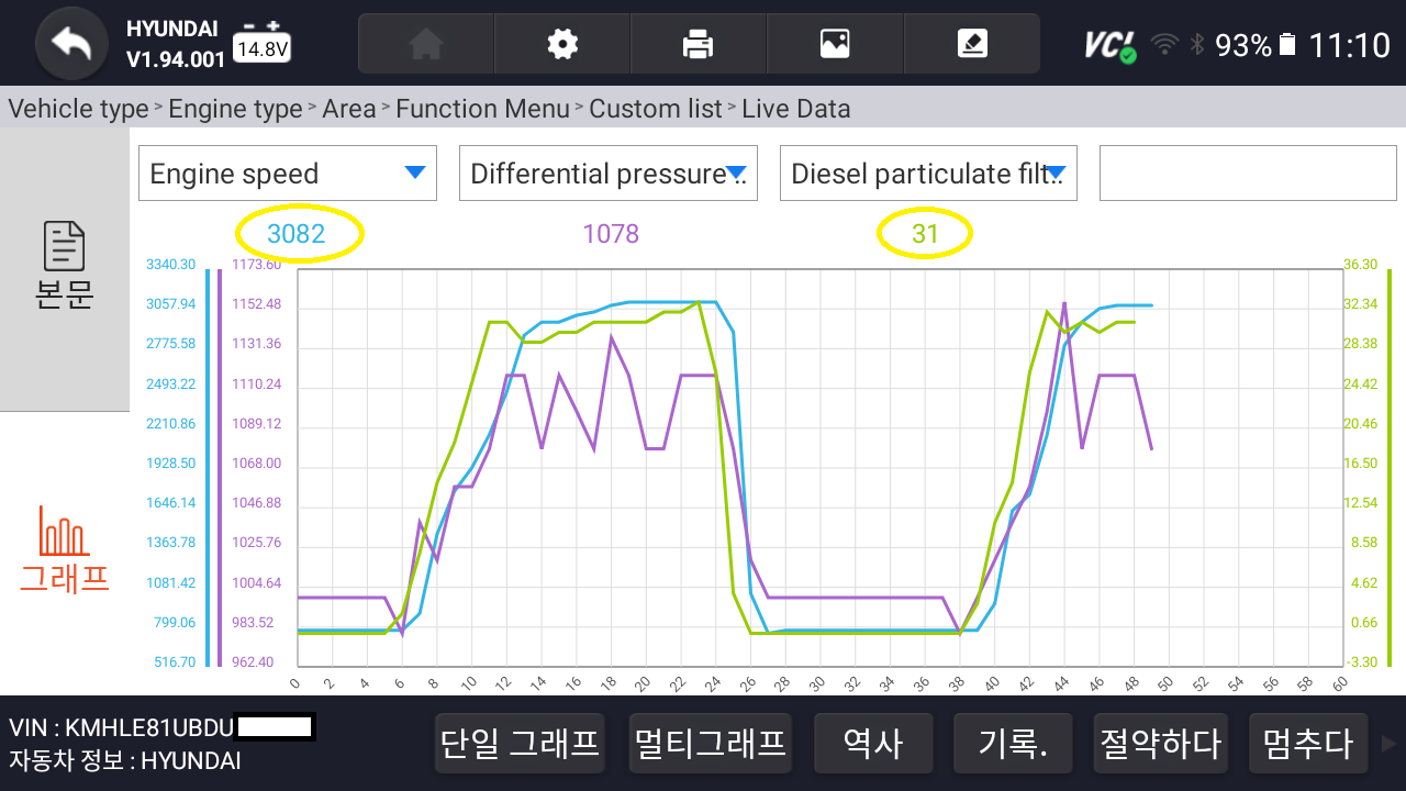 아이들링 상태에서 0 hPa, 3,082 rpm 상태에서 31 hPa 정도의 측정값이 나왔으니 10년 다 돼가는 나의 사공이 DPF 상태는 매우 양호하군.