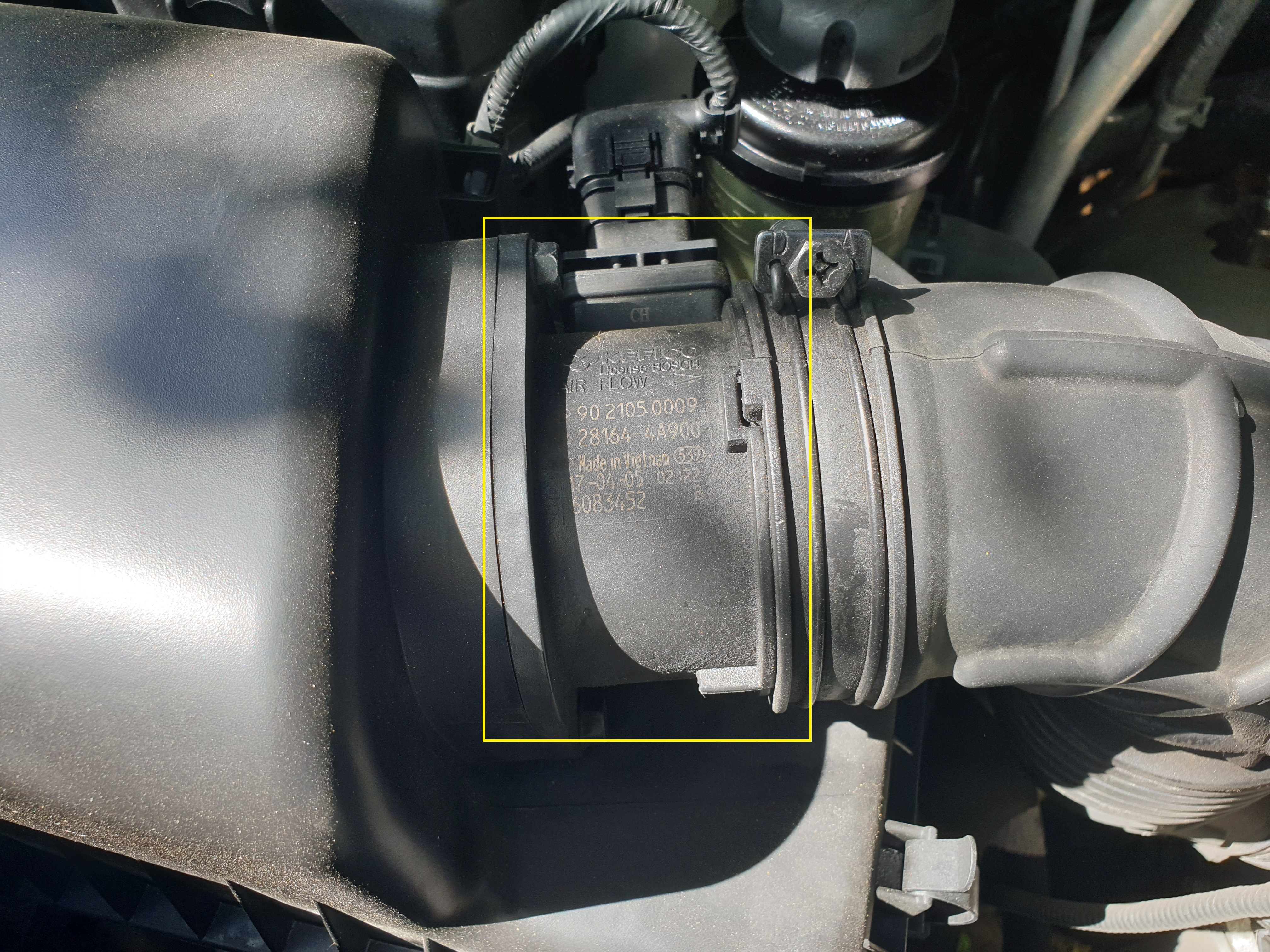 에어플로우 센서는 에어클리너 박스에 위치하고 있다. 흡기 호스를 먼저 분리하여 에어클리너 박스 뚜껑 채로 탈거한 후 10mm 볼트 2개를 풀면 분리할 수 있다.