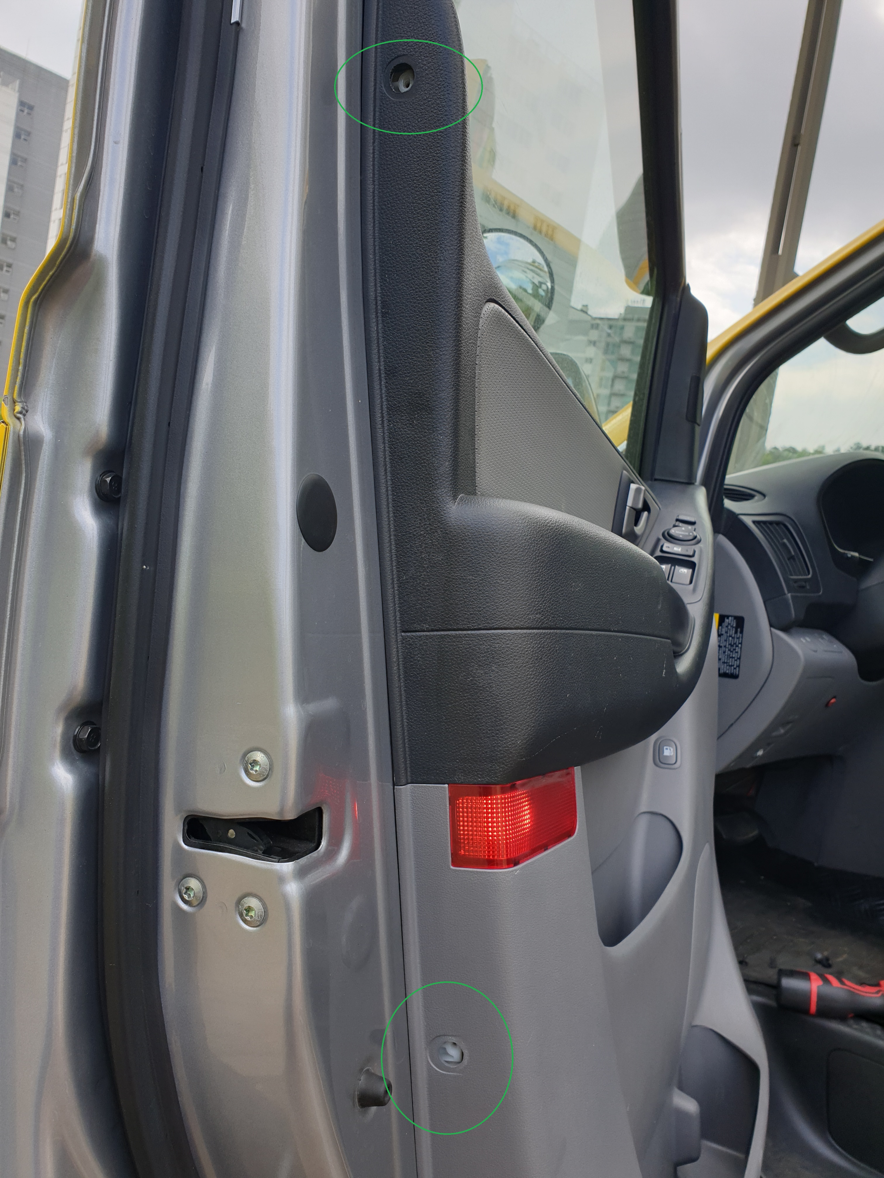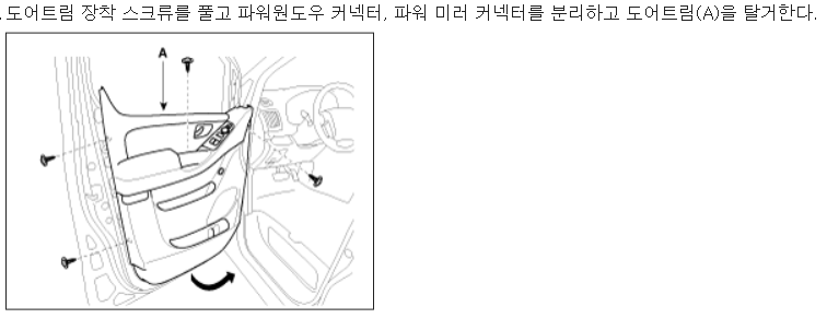 스크류(십자 나사)가 총 5개. 스크류 모두 풀고 도어 트림 아랫부분 틈새에 헤라를 집어넣고 힘주어 당기면 도어 핀이 차체에서 두두둑 빠지면서 분리된다. 도어 트림 내부의 커넥터 모두 분리하여 완전 탈거한다.