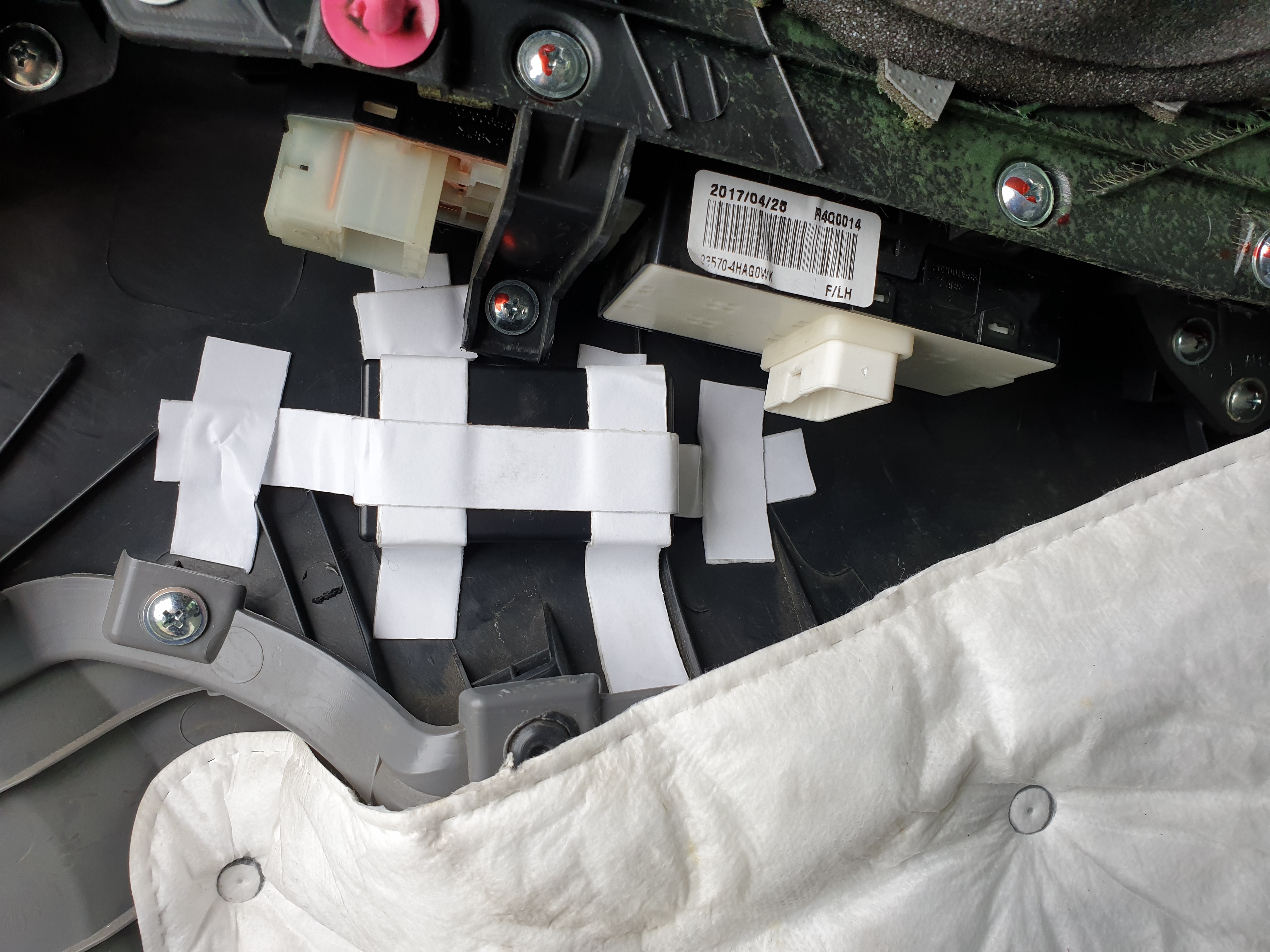 락 폴딩 본체(릴레이)는 도어 트림 쪽에 적당한 곳에 테이프로 덕지덕지 붙였다. 아래 사진의 위치는 막상 해 보니 커넥터 꼽기가 어려워서 다시 떼어내고 다른 위치로 이동시켰다. (이 위치에서 더 왼편으로)