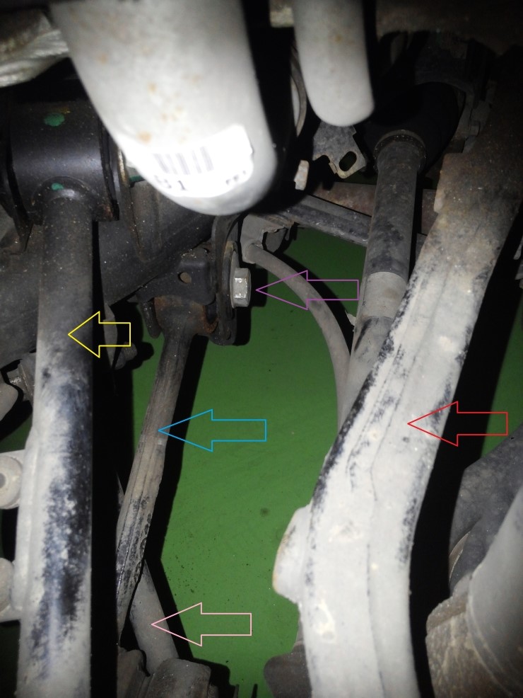 자주색 화살표: 어시스트암에 달린 캠 볼트 (리어쪽 토우인/토우아웃 조정 볼트)