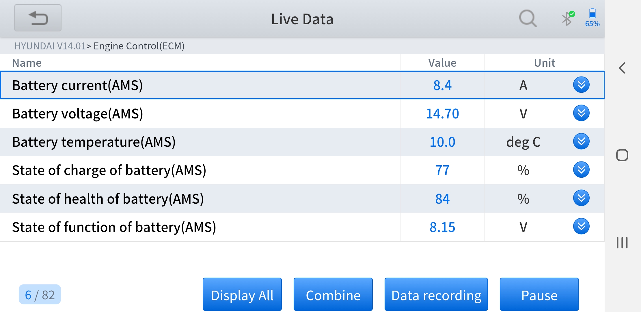이틀 전 영하권에서 첫 시동에서 시동이 안 걸려 점프 스타터로 시동을 걸고 한참 충전을 해 준 후의 상태를 스캐너로 점검. SOH(건강상태)는 84%. 양호한디?