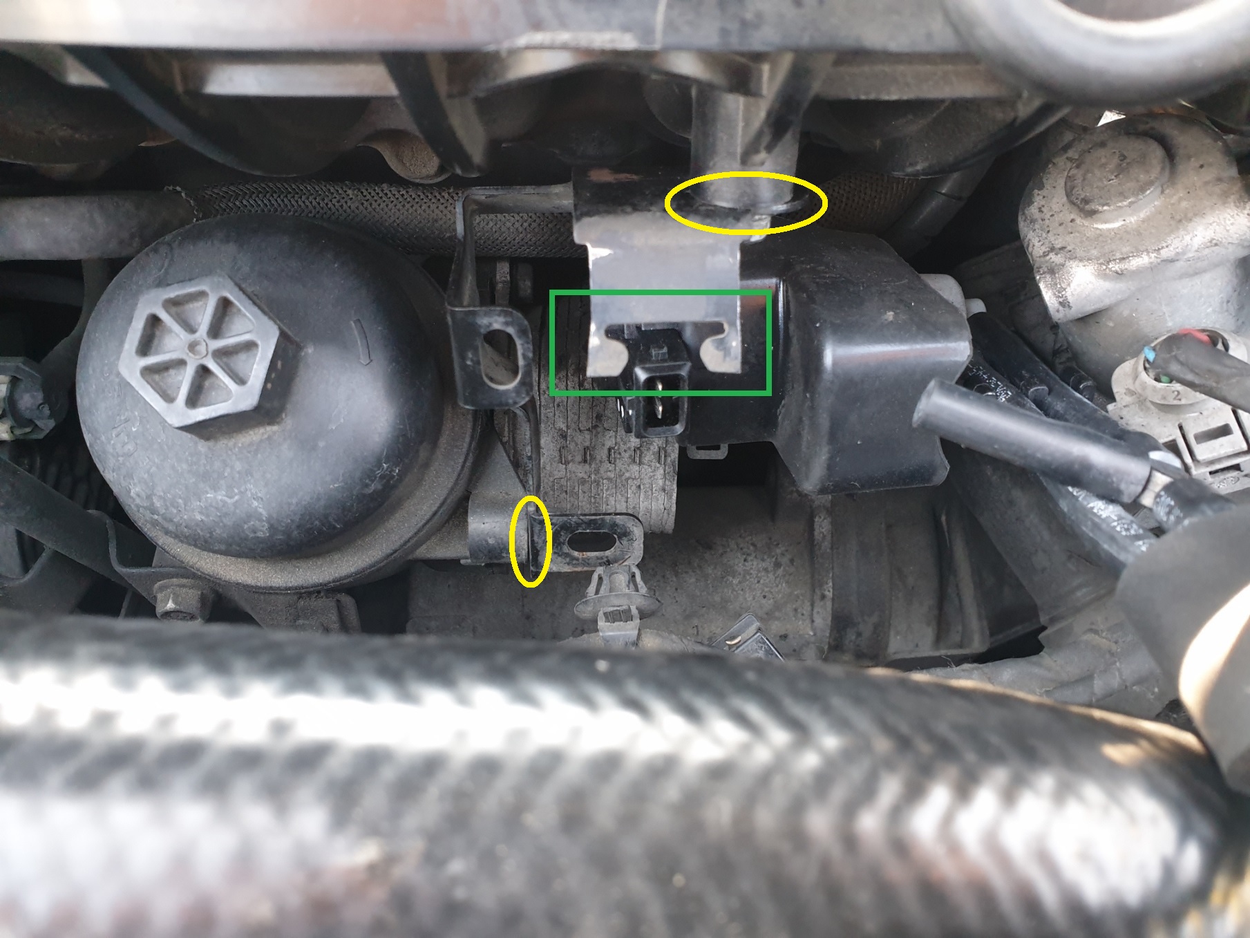 (아래 사진) 녹색 사각형에 EGR 쿨러 바이패스 밸브가 단순히 슬라이딩 방식으로 꼽힌다. 노란색 원 위치에 10 mm 고정 볼트 2개가 자리 잡고 있다. 7시 방향의 볼트는 안쪽에 숨어 있다.
