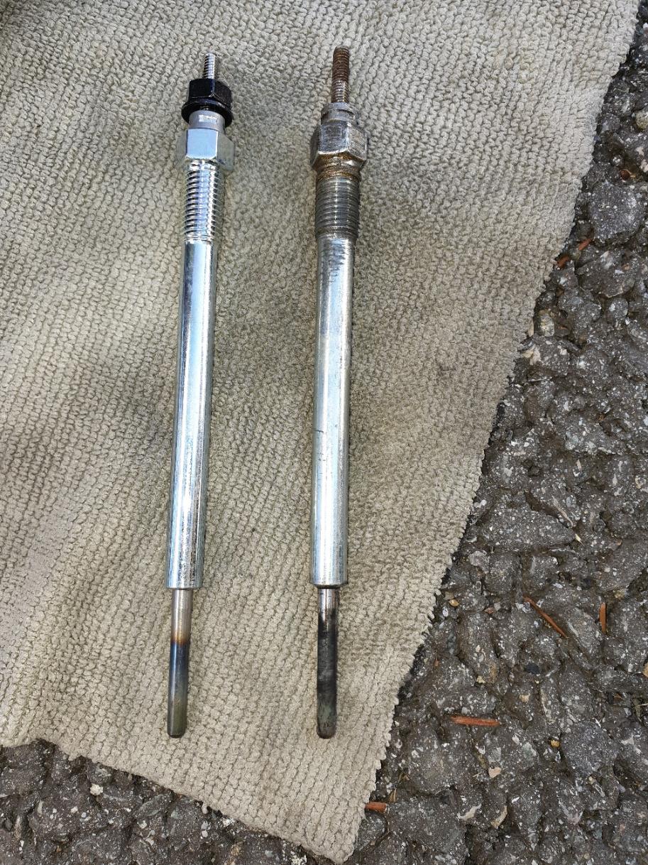 (아래 사진) 신품, 구품 예열 플러그. 1번 구품은 지난 번 살짝 윗부분 일부만 빠지는 상황에서 고착방지제를 나사산에 조금 바르고 재장착해 놓았는데 이번에는 아주 쉽게 풀리더군.