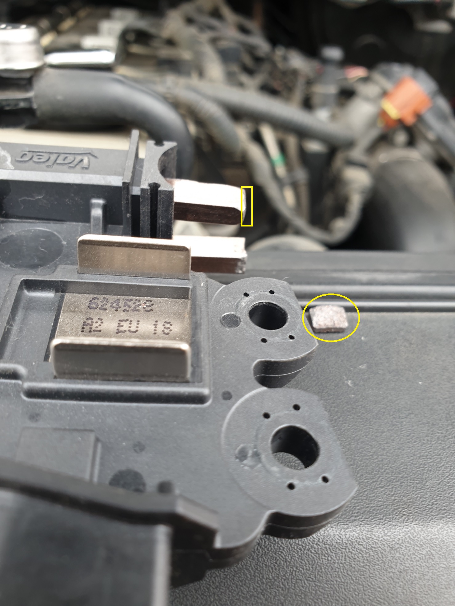브러쉬가 2개인데 위쪽 브러시 일부가 부러졌다. 이건 빼지 말아야 할 슬립 링 커버를 뺐다가 다시 꼽을 때 안 들어가는 걸 망치로 때려서 강제로 꼽았는데 이 과정에서 브러쉬 끄트머리가 일부분 부러지면서 커버가 꼽힌 것이었다. 그러면서 브러쉬가 튀어나와 슬립 링과 접촉해야 하는데 브러쉬가 안쪽으로 밀려 들어가서 안쪽에서 걸려 버린 것이다. 그러니 브러시 2개 중 1개가 슬립 링에 아예 접촉하지 않으니 알터에서 전원 생산이 안 되었던 거고. 그 결과 계기판에 충전경고등이 뜬 것이다.