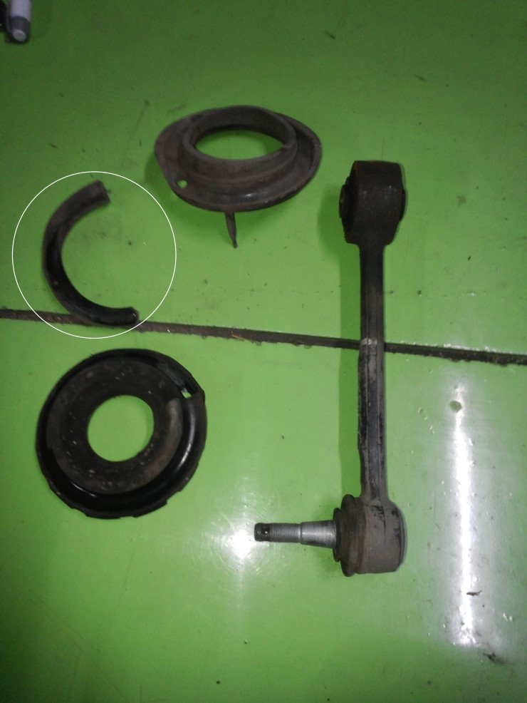 탈거한 스프링 어패 패드/로워 패드, 그리고 어시스트 암. 트레일링 암은 어데로 갔지? 흰색 원안에 있는 부품은 스프링 하단에 끼워지는 건데 난 것도 모르고 상/하 패드 어딘가에서 오래돼서 떨어져 나온 걸로 생각하고 버렸지 뭐야. 나중에 소음이 발생하길래 이거 하나 안 껴서 그런가 해서 이 부품 살려고 했더니 따로 판매되지 않고 스프링에 끼워져서 판매된다. 아 써글.. 그래서 또 열심히 검색했더니 에쿠스 전용으로 이 부품이 있다. 이름하여 스프링 튜브라는 이름의 부품이더군.