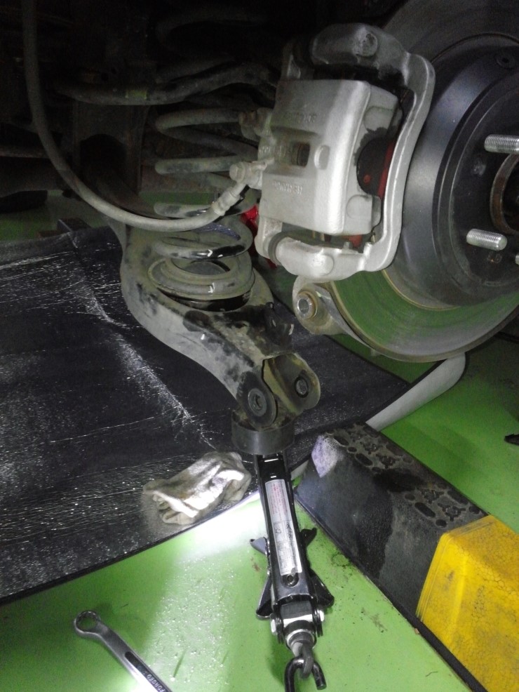 스프링 탈거할 때. 로워암 하부에 작키 받치고 너클에 연결된 볼트 풀고 작키를 서서히 내리면 로워암이 저렇게 한쪽이 쳐지면서 스프링 장력이 해제되고 빼낼 수 있음. 나중에 저 볼트 구멍을 다시 못 맞춰서 사단이 남. 쇼바 하단 볼트를 풀면 너클이 아래로 축 쳐지는 걸 알았지만 쇼바 하단 볼트가 안쪽에 끼워져 있어서 리프트에 띄우든지 또는 적합한 수공구가 있으면 가능한데 나한테 그런 게 없어 풀 수가 없었고 결국 해결을 못함.