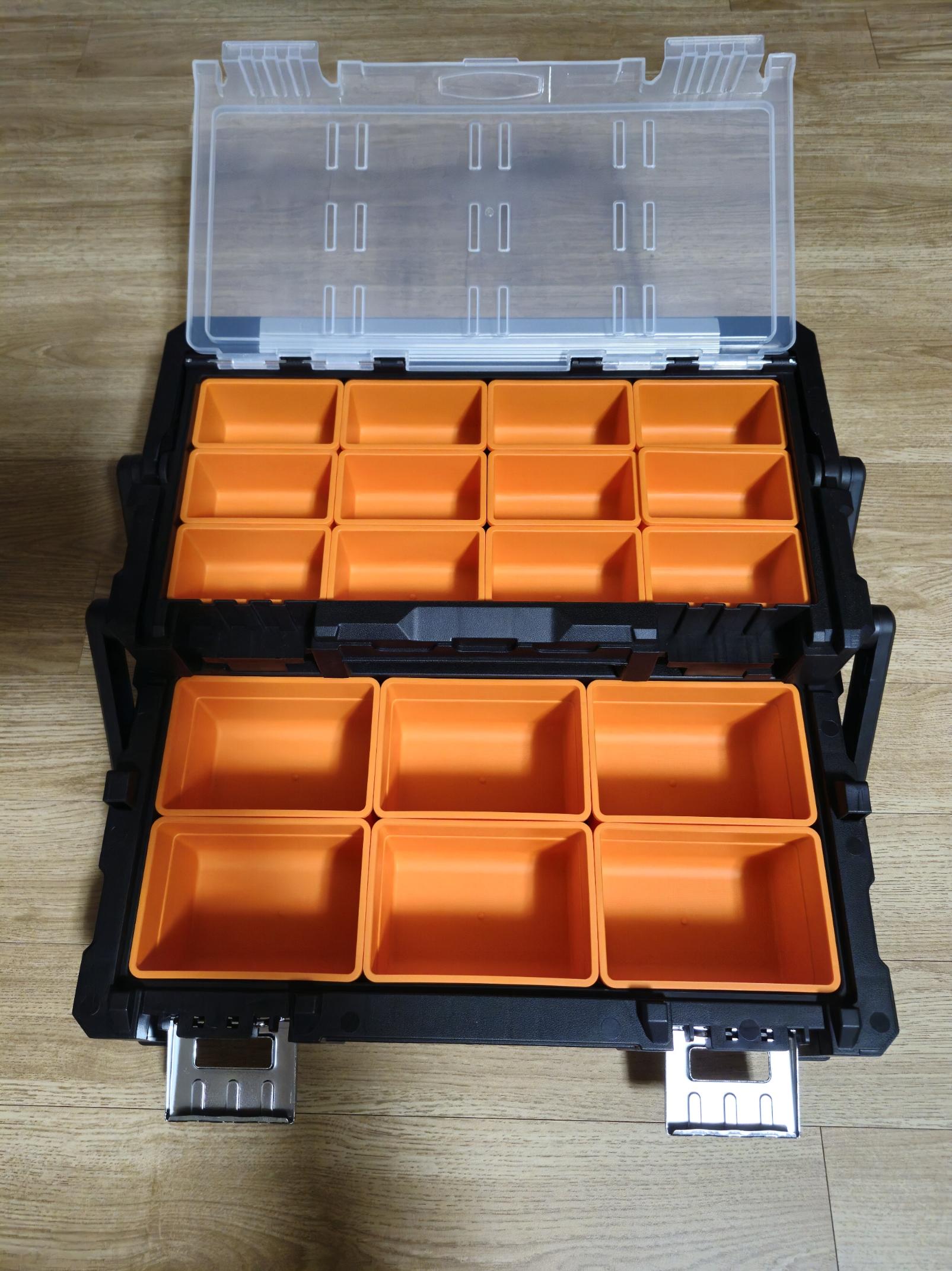 아래 칸에는 미니 박스를 4개 정도 빼내고 그 공간에 공구들을 집어넣고 나머지 미니 박스에는 사이즈별 복스알, 볼트/너트 수납용으로 쓸 생각이다. 기존 사용하던 공구함은 내부 수납 공간이 제대로 구분되어 있지 않다 보니 마구 때려 넣고 썼었다. 그래서 매번 복스알 찾으려면 공구함에서 내용물 절반을 빼내고 일일이 사이즈를 찾아야 하다 보니 매우 귀찮었다. 이제 좀 쉽게 복스알이며 내용물을 찾을 수 있겠군.