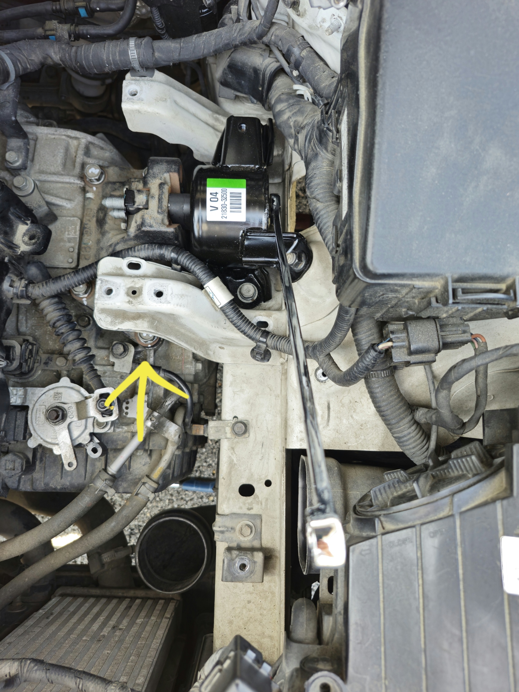 11. 서포트 브라켓을 탈거한 후에 미션 미미 하단에 위치한 작업하기 성가신 볼트(14mm 1개)부터 해체한다. 위 과정까지 잘 왔다면 볼트 접근이 바로 된다. 만약 서포트 브라켓을 탈거하였음에도 공구(라쳇 렌치 + 연장대) 접근이 여전히 곤란하면 이때는 미션 하단을 받친 작키의 높이를 내려준다. 여기에 더하여 운전석 쪽 순정 잭 포인트를 더 높게 들어 올리면 차체가 더 올라가면서 미미 하단 볼트의 접근이 더 용이해진다. 공구 접근 공간만 확보되면 된다. 하단 볼트를 해체한 후에 미미를 고정하고 있는 나머지 볼트(14mm 2개)/너트(14mm 1개)를 해체하고 미션 미미를 차상에서 탈거한다.