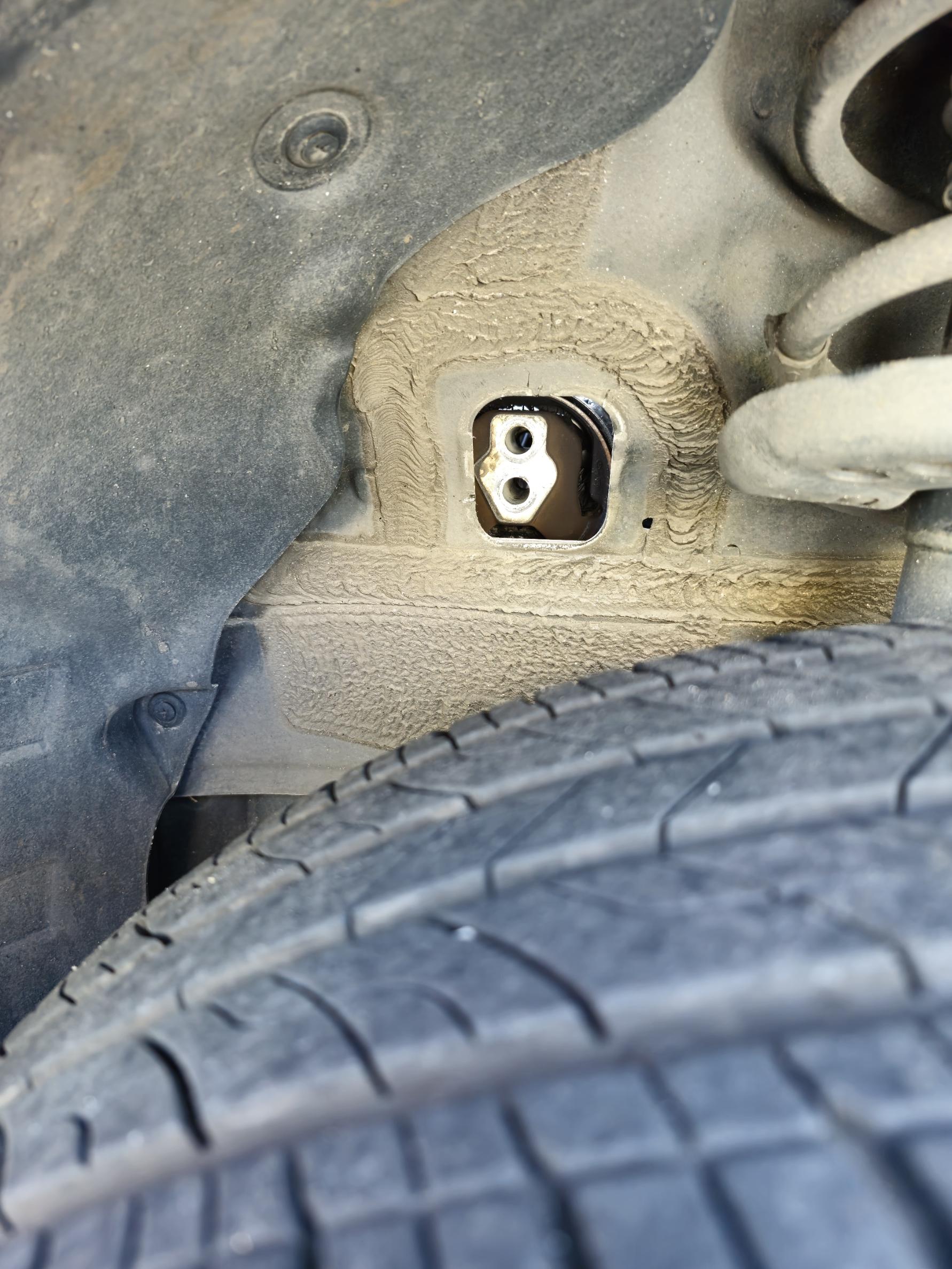 운전석 휠 하우스 안쪽의 서비스 홀 커버를 빼고, 미션 미미 관통볼트(14mm) 2개를 분리한다. 겁나 기다란 볼트다. 관통볼트를 완전히 풀었는데도 볼트가 쉽게 안 빠지면 여전히 차량 하중이 볼트에 가해지고 있기 때문이다. 따라서 이런 경우 미션 밑에 받친 작키 높이를 더 올려주어야 한다. 높이를 잘 맞추면 볼트에 가해진 하중이 사라지고 쉽게 관통볼트가 빠지게 된다.