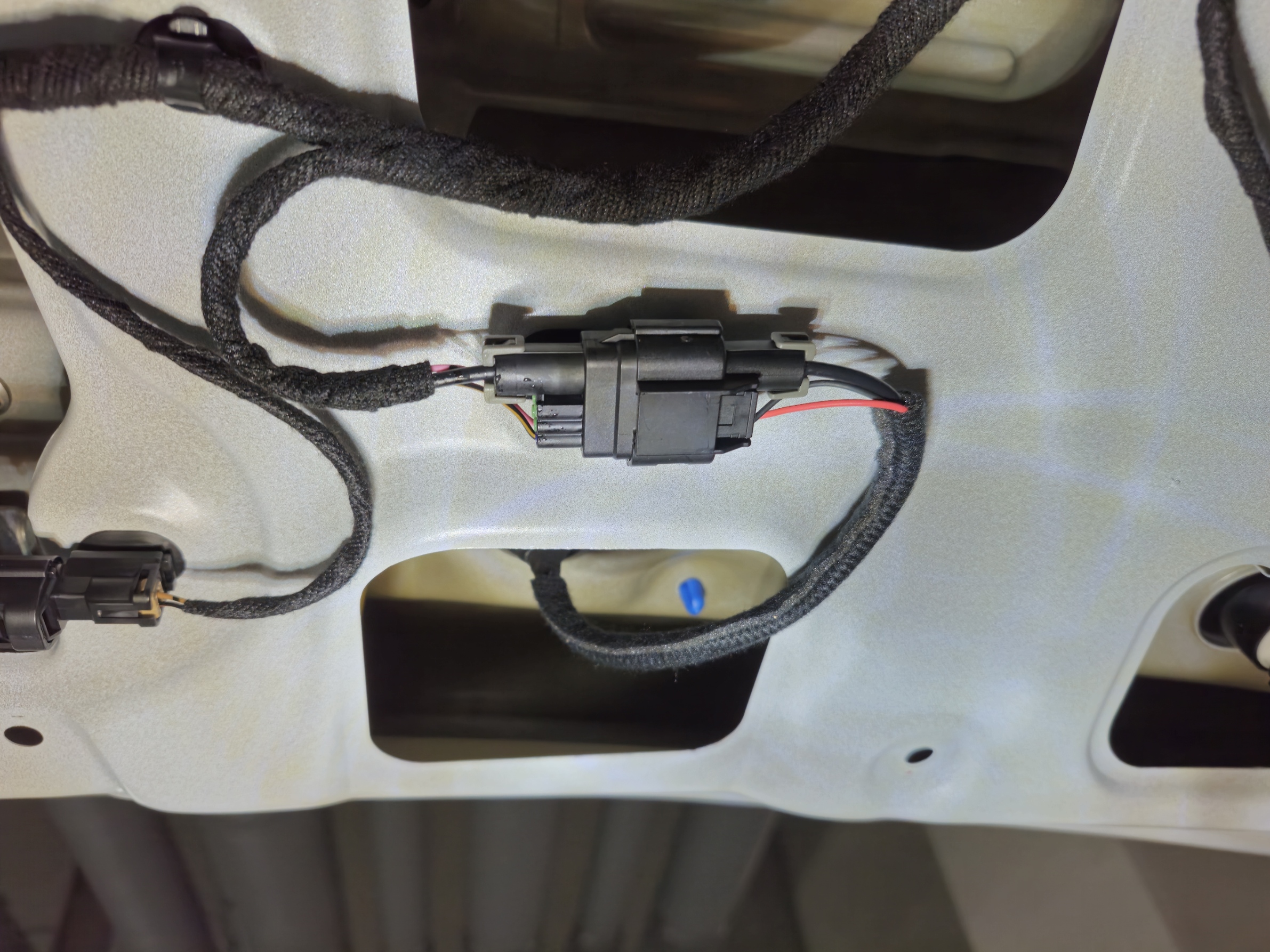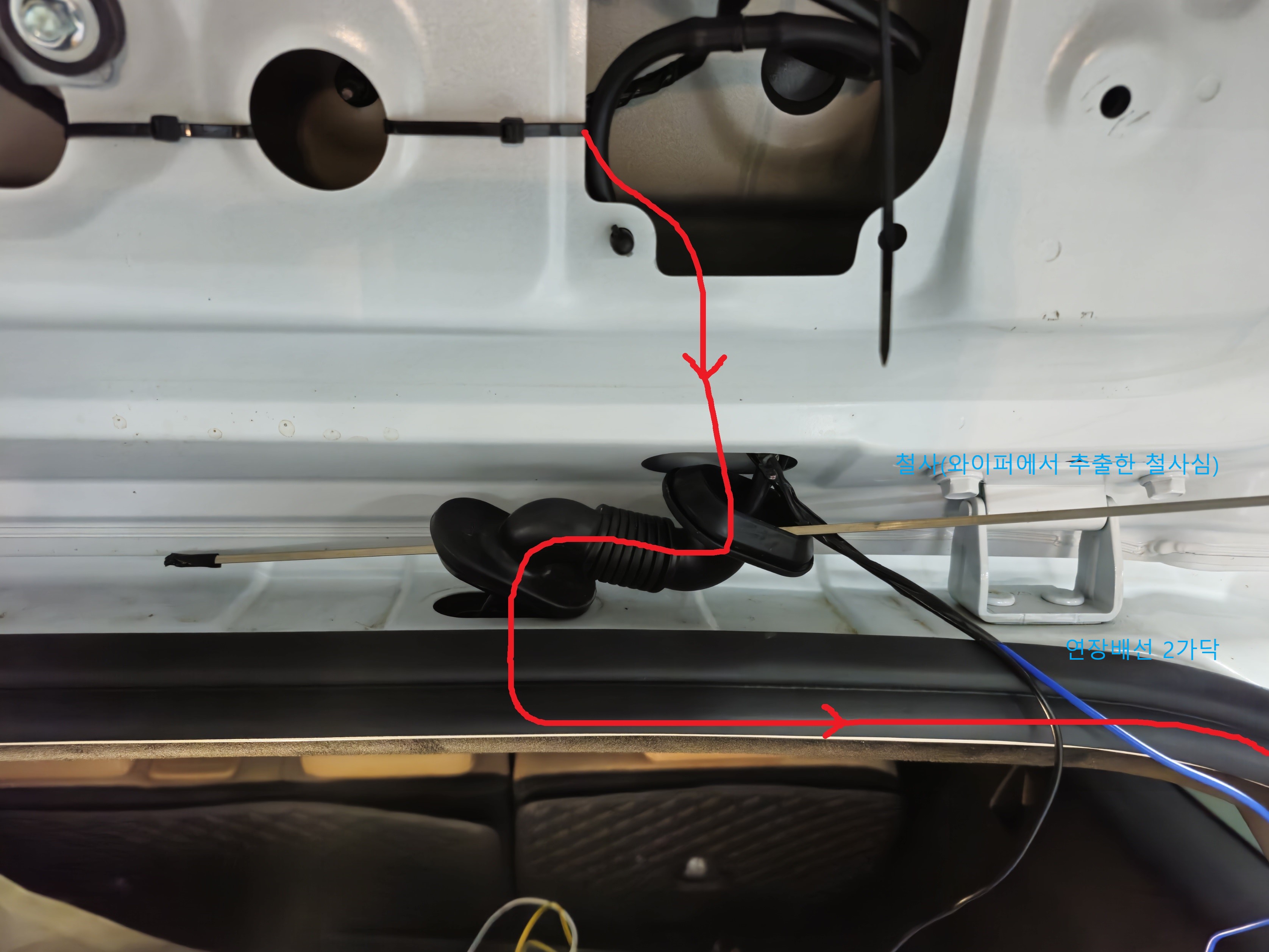연장 배선 두 가닥을 테일게이트 상단 주름관을 통해서 게이트 필라 트림에 타공한 위치까지 인입시킨다. 옷걸이 철사 등을 이용한다. 유튜브에 타 차종 작업 동영상이 꽤 있으니 경험이 없을 경우 반드시 시청하고 작업할 것.