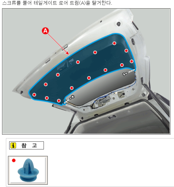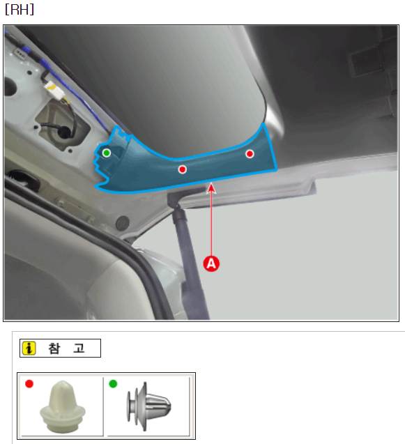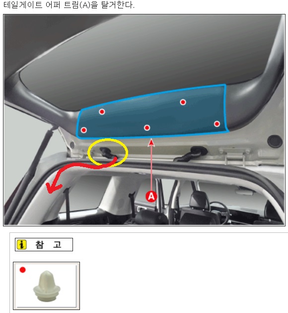 *정비지침서 사진의 녹색 표시점 고정 클립이 플라스틱 재질의 갈고리 모양으로 나오는데, WPC 부품 정보에서는 모양이 다른 클립으로 부품 정보가 뜸. 탈거 시 그냥 잡아당기면 되는데 엄청 빡세게 결합되어 있으므로 내 것이 아니다 하는 마음으로 과감히 잡아당겨서 탈거.