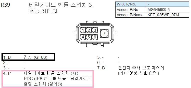 R39 커넥터의 1번 검은색 배선이 접지, 4번 핑크색 배선이 테일게이트 열림 스위치 신호선이다. 따라서 장착할 스위치에 연결시킬 연장 배선 두 가닥을 1번/4번 배선 중간을 까서 각각 연결시키면 된다.