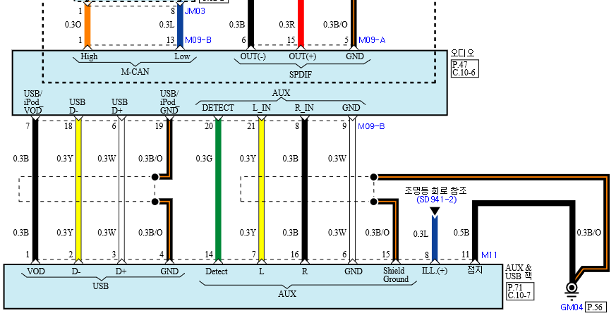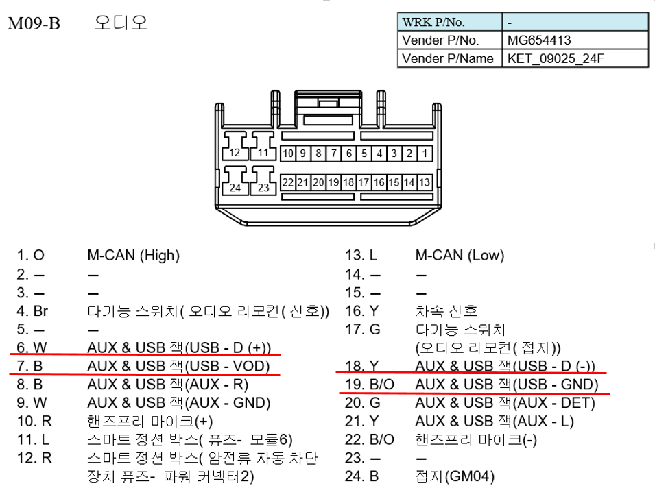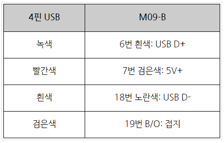 다시 자동차 전장회로도로 돌아가서 보면, M11 커넥터의 USB 관련 배선 4가닥은 M09-B 커넥터 쪽으로 연결되어 있다. M11 커넥터까지 직접 연결해도 되나 오디오 쪽 커넥터보다 더 먼 거리에 있는 M11 보다는 오디오 뒤편에 있는 M09-B 커넥터에서 배선 따는 작업을 하는 것이 더 편리하다.