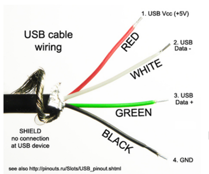 USB 케이블은 국제적으로 공통 방식이므로 배선 색상 별로 용도가 정해져 있다.