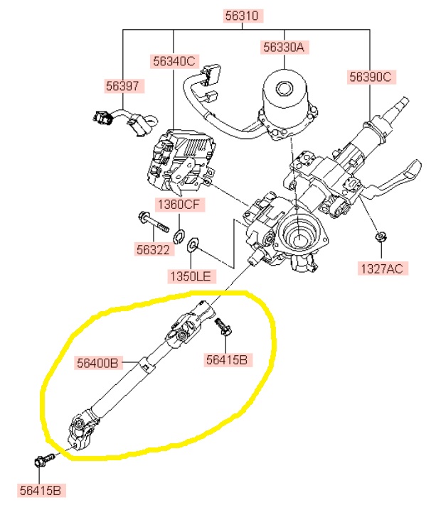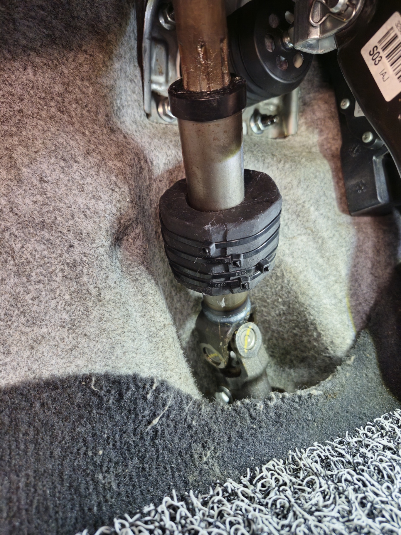 핸들(스티어링) 샤프트 = 유니버설 조인트(아래 노란색 부분)에 두터운 방진고무를 끼워서 핸들을 타고 올라오는 진동을 조금이라도 감쇄시켜 보고자 시도해 봅니다.