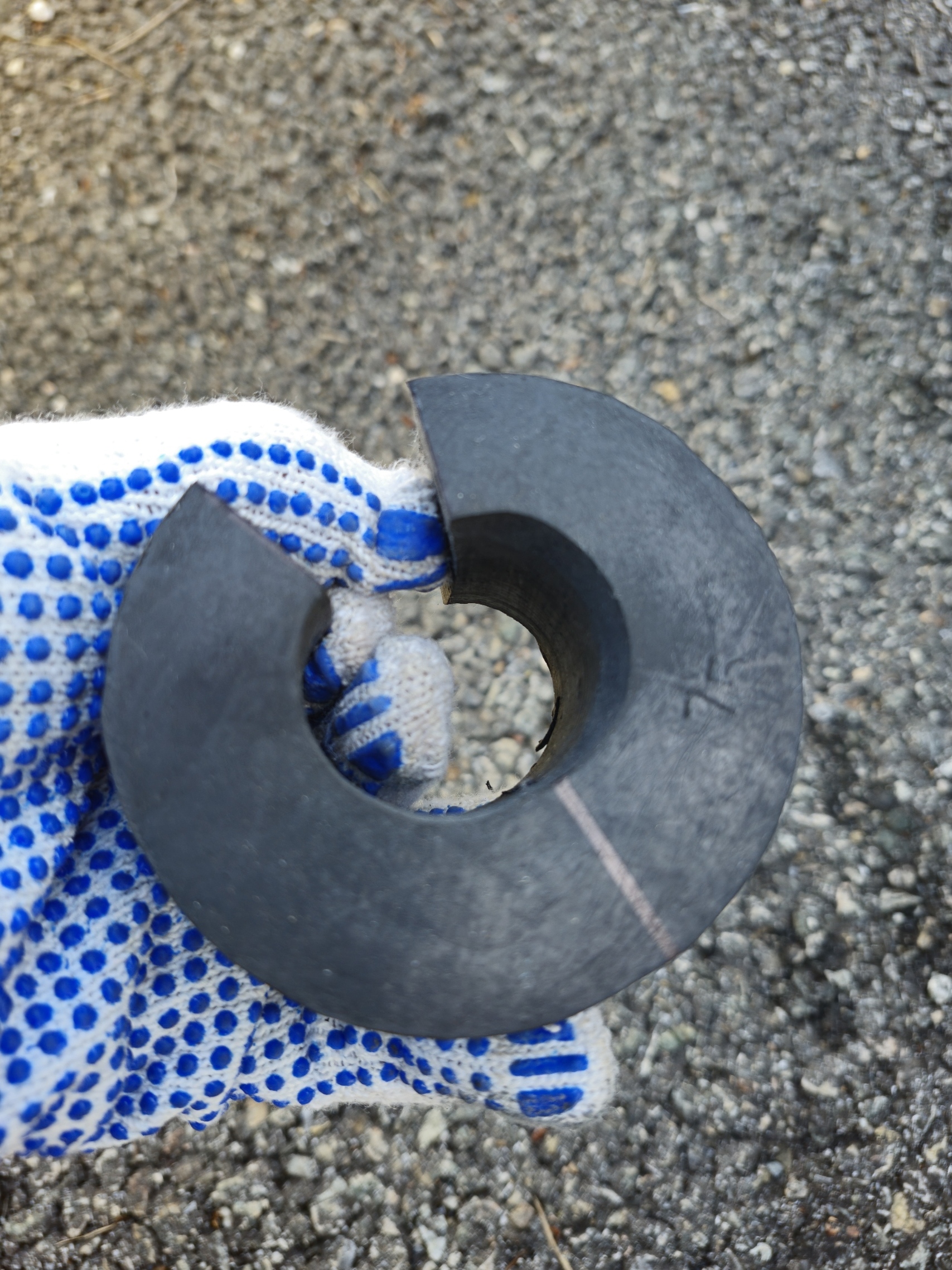 잘 드는 커터 칼(말캉한 고무가 아니고 꽤 딱딱하기 때문에 칼로 자르기도 쉽지 않음)을 대고 고무망치로 칼 등을 톡톡 쳐서 수직으로 자른다. 내경 20mm 짜리는 한쪽을 자르고 벌려서 끼우려니 잘 안 벌려진다. 그래서 1/2 토막 냄.