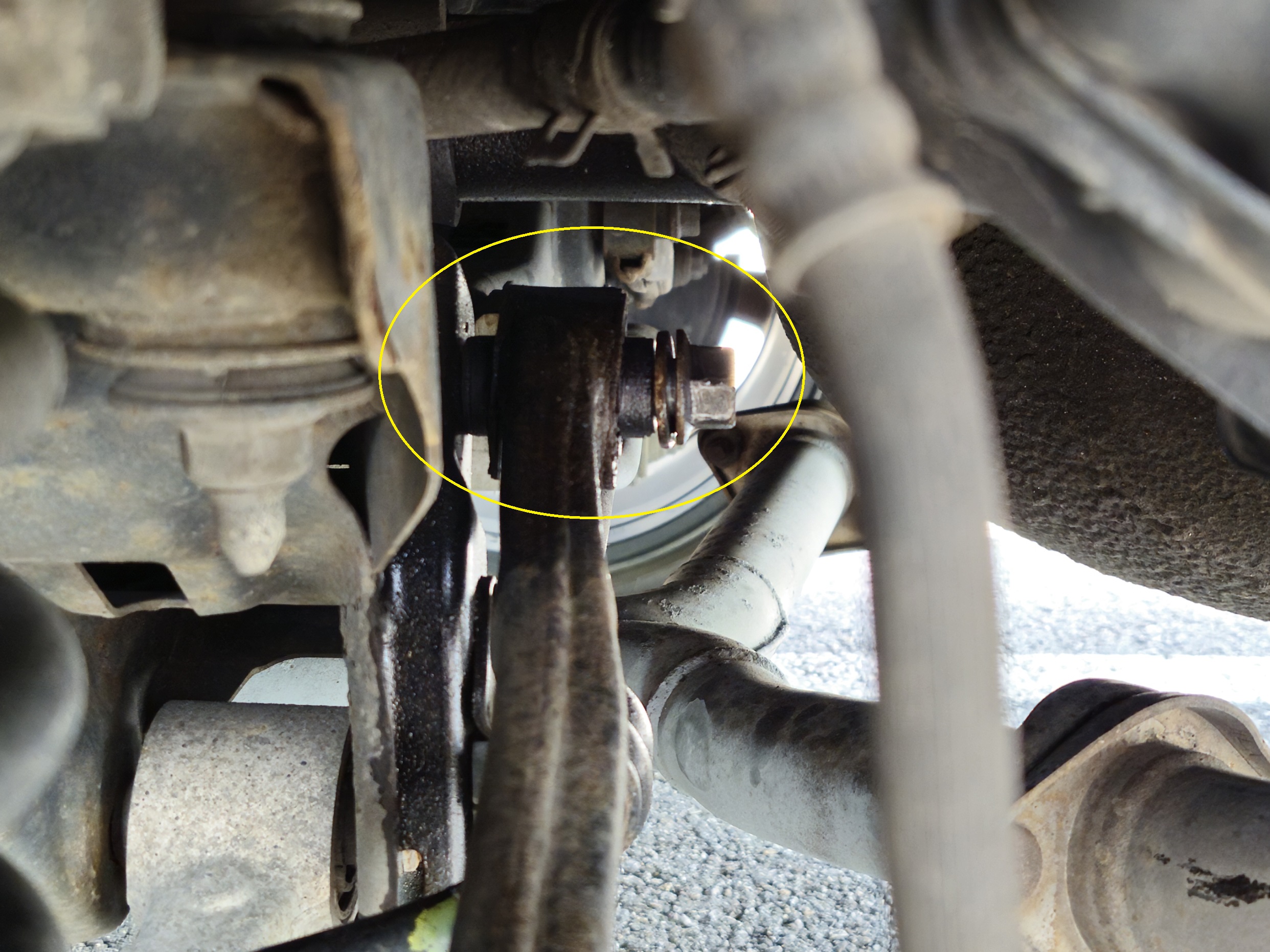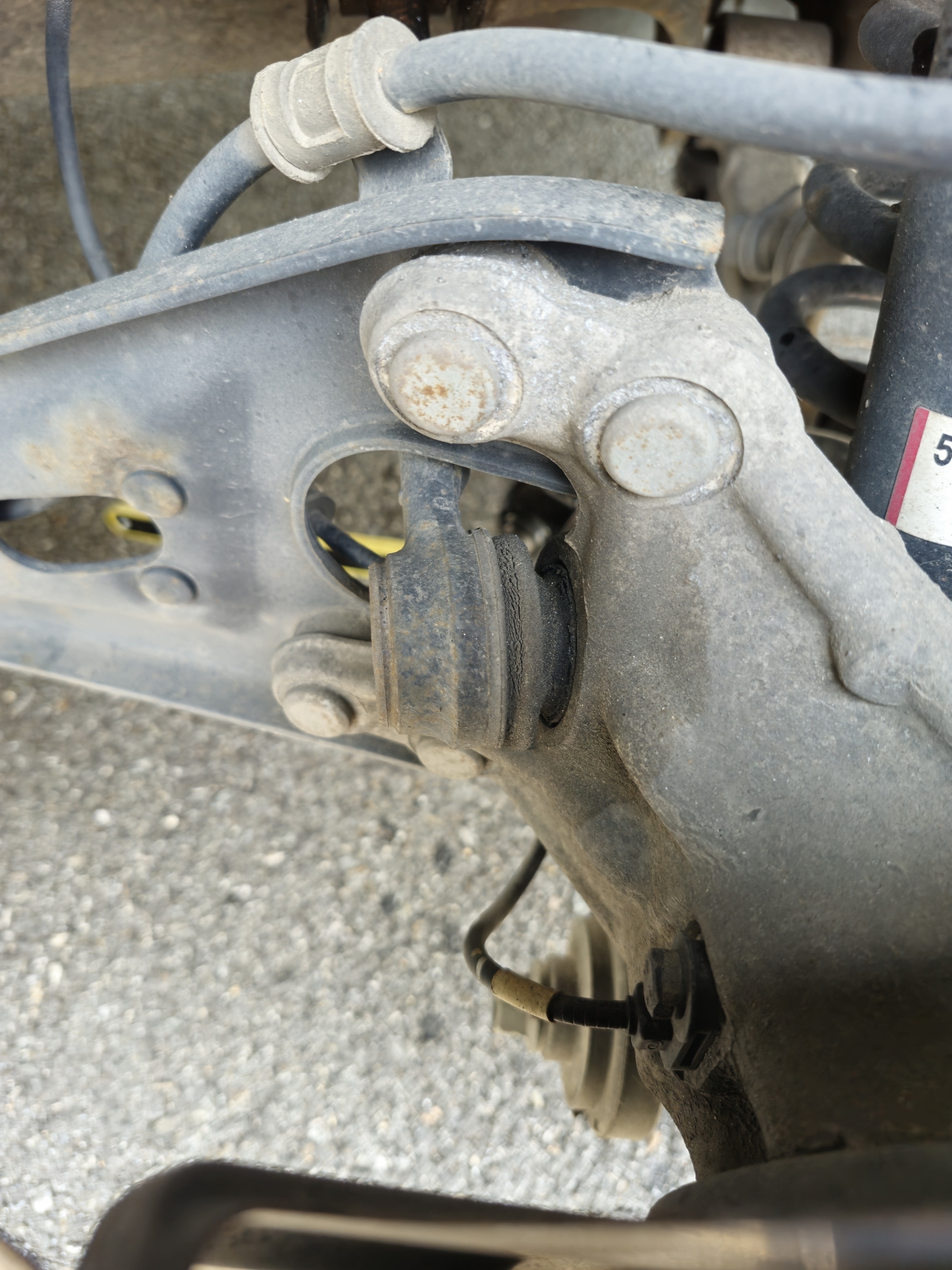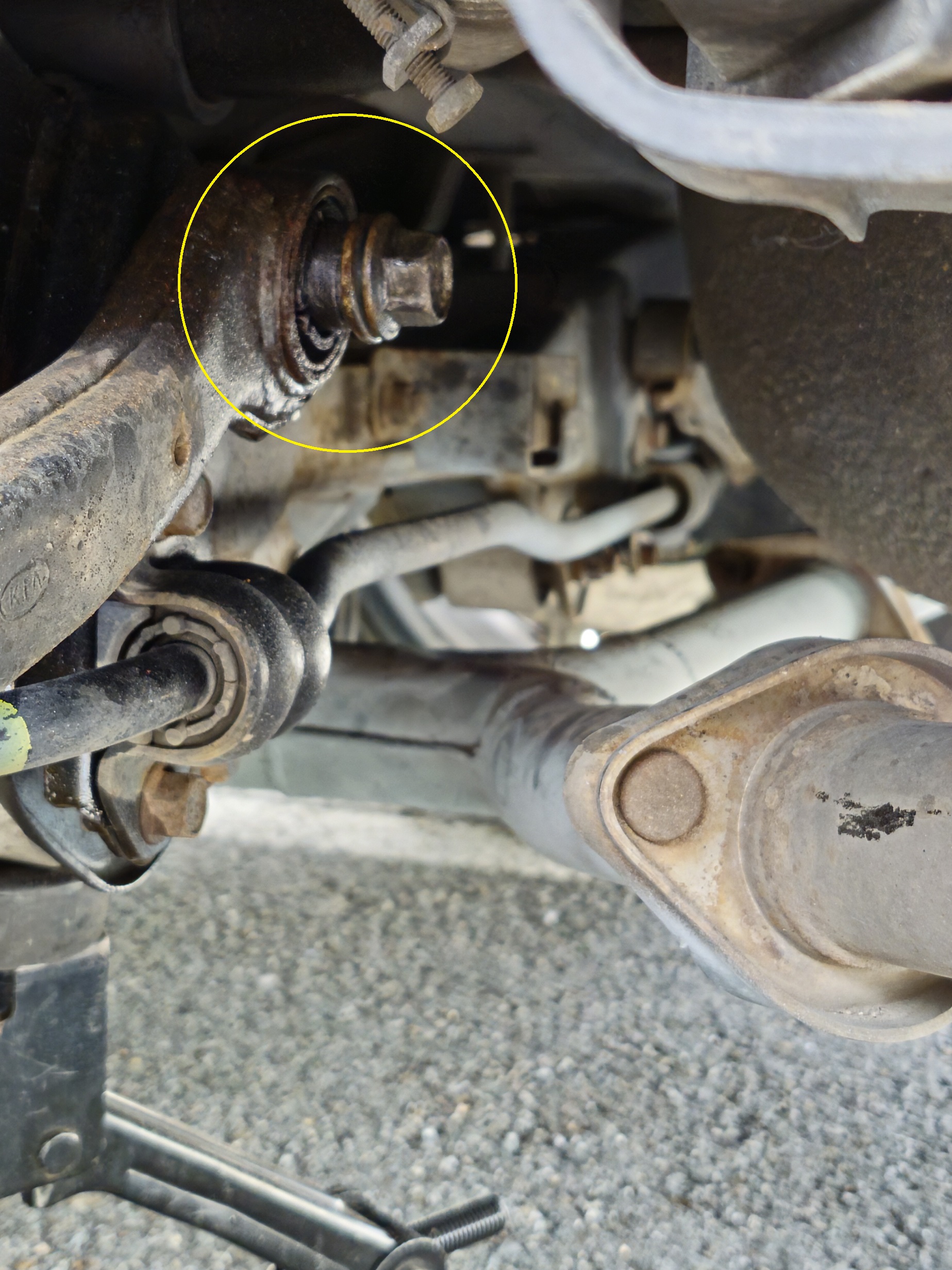 근데 작업 당시, 운전석 리어 타이어를 탈거한 후에 작업할 부위를 보니 느낌이 싸하다. 그래서 4번 리어 쇼바의 너클 부 해체부터 5번 어퍼 암 너클 부 해체를 생략하고 6번 어퍼 암 서브 프레임 측 볼트부터 풀기로 했다.