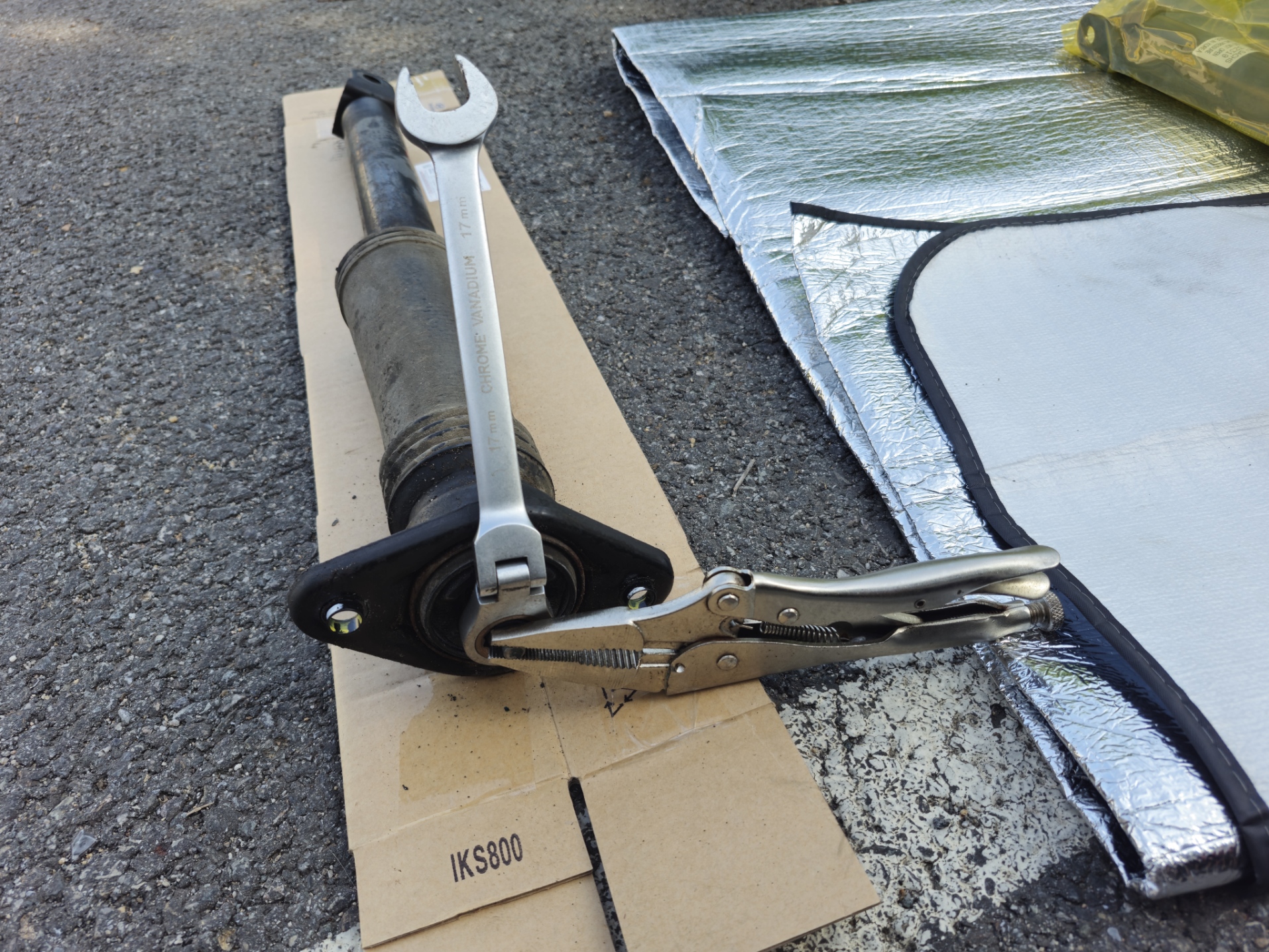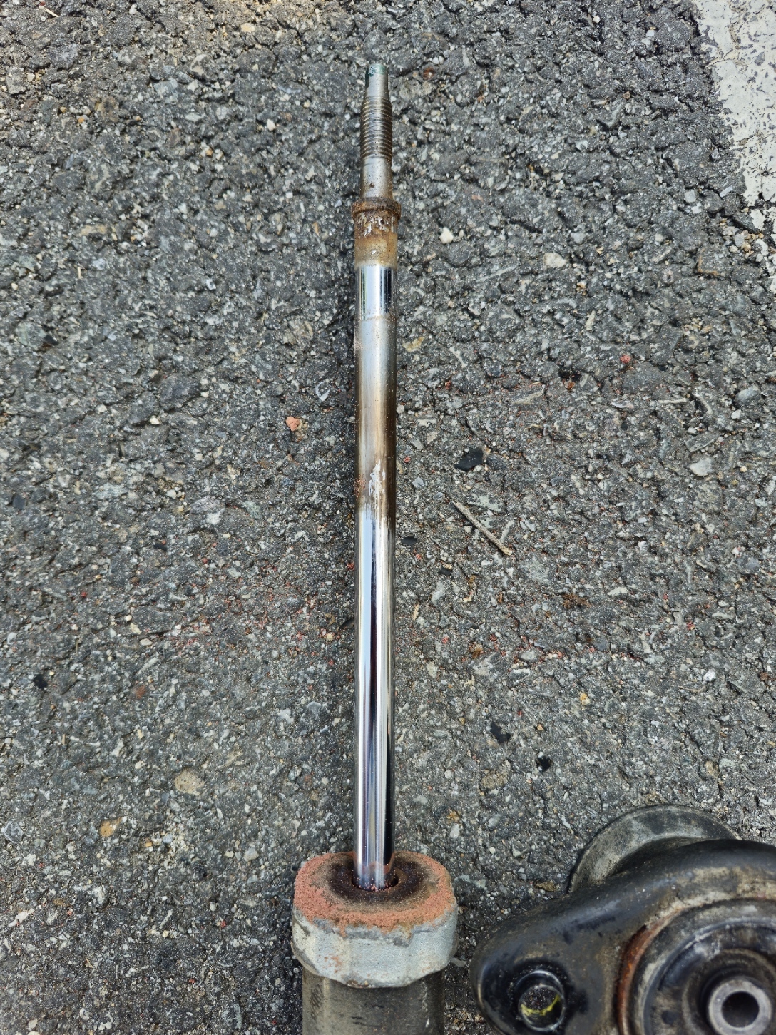 탈거한 쇼바에서 마운트를 분리. 마운트 고정 록 너트를 분리/체결할 때 쇼바 로드가 같이 휙휙 돌아가기 때문에 로드 끝단을 몽키스패너 또는 바이스 플라이어로 잡아주고 록 너트를 풀거나 체결해야 한다. 강려크한 임팩 렌치가 있으면 로드 끝단을 잡지 않고도 풀고 조일 수 있긴 하다.