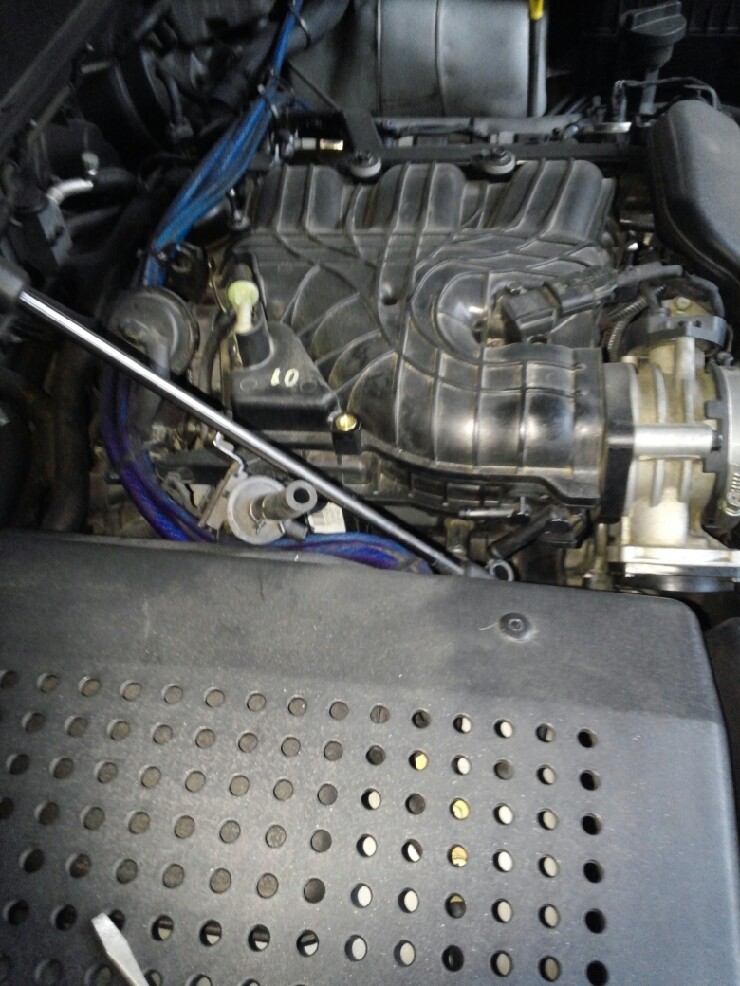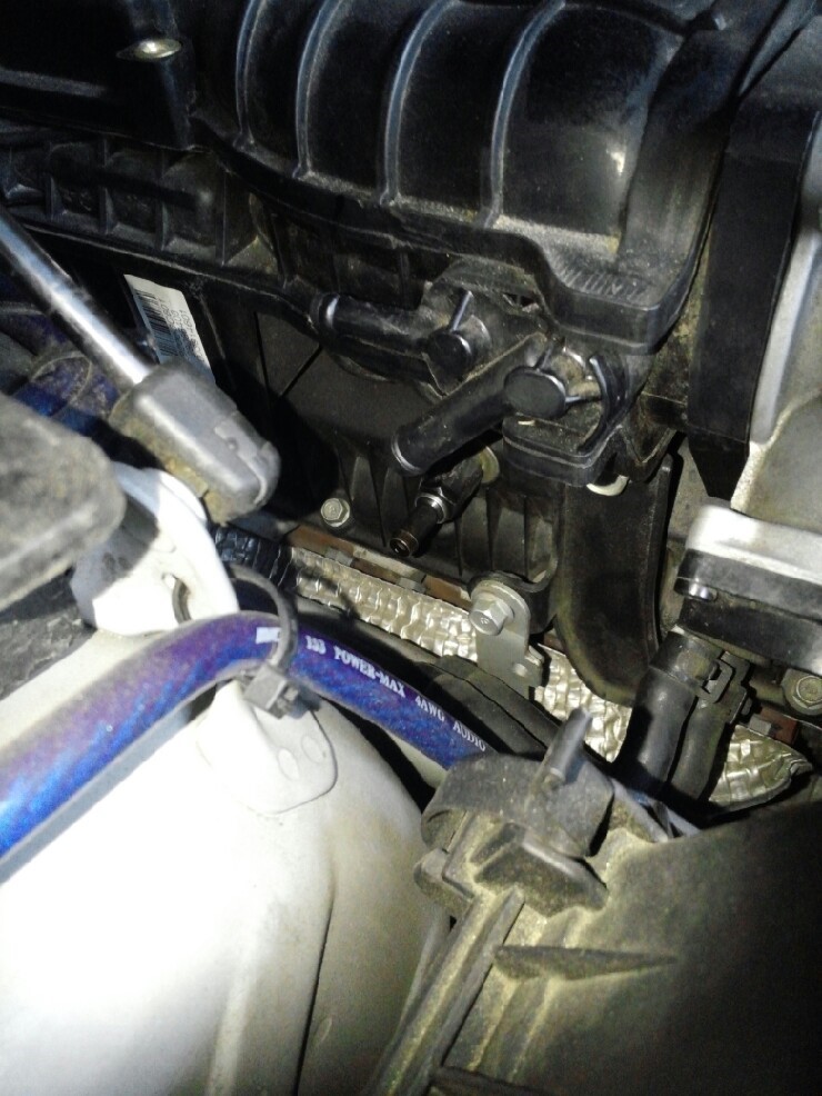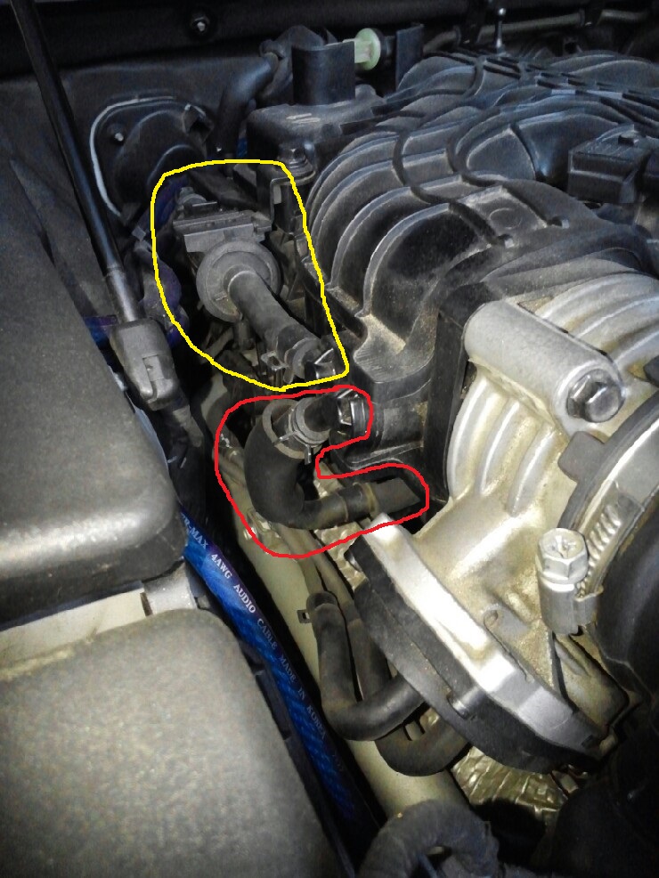 우선 위치부터. 엔진 왼쪽의 쓰로틀 바디 옆쪽이다. 노란색 부분은 PCSV(Purge Control Solenoid Valve)이고 빨강색 부분이 바로 PCV(Positive Crankcase Ventilation) 밸브이다.