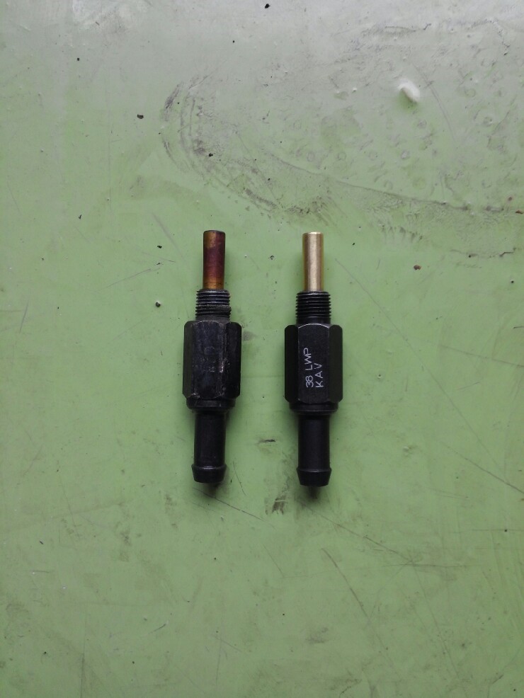 PCV 밸브 몸통은 6각형이고 사이즈는 14 mm. 따라서 14 mm 스패너나 렌치로 푼다. 탈거한 구품과 신품. 좌측의 구품은 6년차치곤 외양에는 슬러지도 안 끼었고 비교적 양호한 상태다. 흔들어 보았더니 달그락 소리가 신품보단 약하지만 입으로 불었더니 통기도 원활한 편이다. 달그락 소리가 약한 건 스프링 장력이 약해졌거나 내부에 슬러지가 약간 끼어서 그럴 걸로 추정된다. 그동안 너 수고 많았으니 이젠 쉬렴.