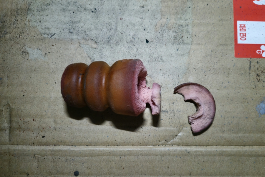 관련 부품이 모두 신품이라 탈거한 쇼바 앗세이는 그대로 휴지통으로. 궁금해서 분해했더니 이쪽도 범퍼 러버가 삭아서 부러져 있네.