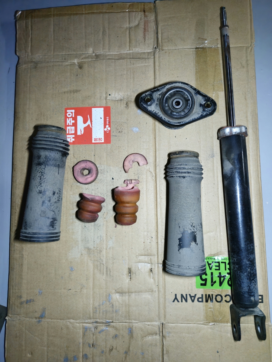 신품 쇼바에 신품 범퍼 러버와 더스트 커버까지 끼우고 신품 마운트 체결(미리 조립해 놓았음).