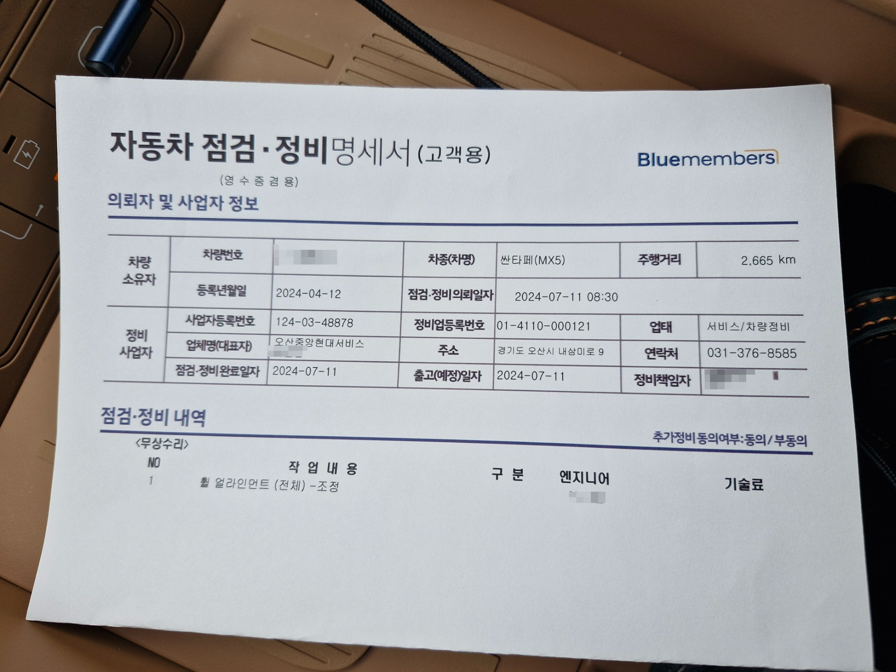 이윽고 예약일에 입고해서 설명을 드리고 얼라인먼트 점검을 했다. 곁에서 지켜볼 수 없기에(안전사고 문제로 정비 현장에는 외부인이 함부로 들어갈 수 없음) 좀 답답했지만 점검이 끝나고 안내를 받기를 얼라인먼트 값이 좀 틀어져 있는 걸 확인했고 수정을 했다고 한다.