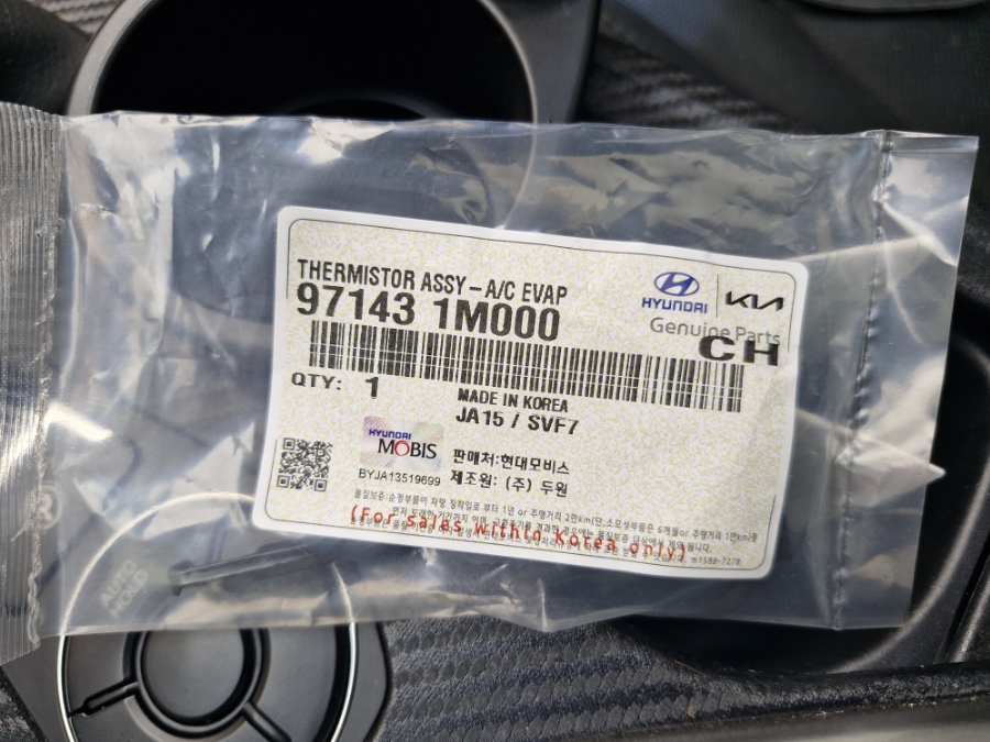 다름 아닌 에어컨 핀 센서 교체. 정식 명칭은 "이베퍼레이터 (온도) 센서"이다. 센서 모양이 기다란 핀 모양처럼 생겼다고 해서 그냥 현장에서 핀 센서라고 주로 불리운다.